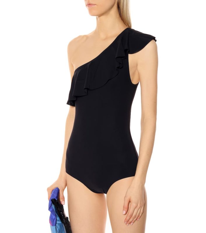- Le maillot à rayures blanches et jaunes et bretelles à volants Chloé Calipige
