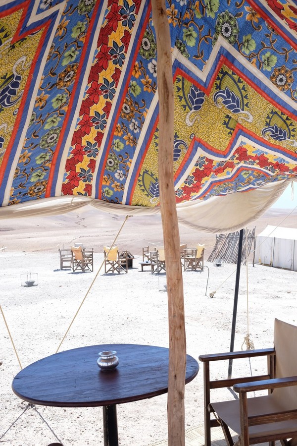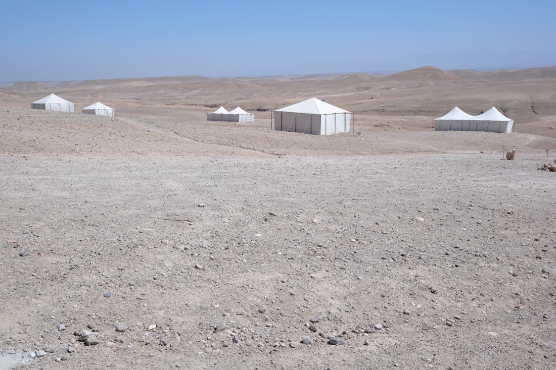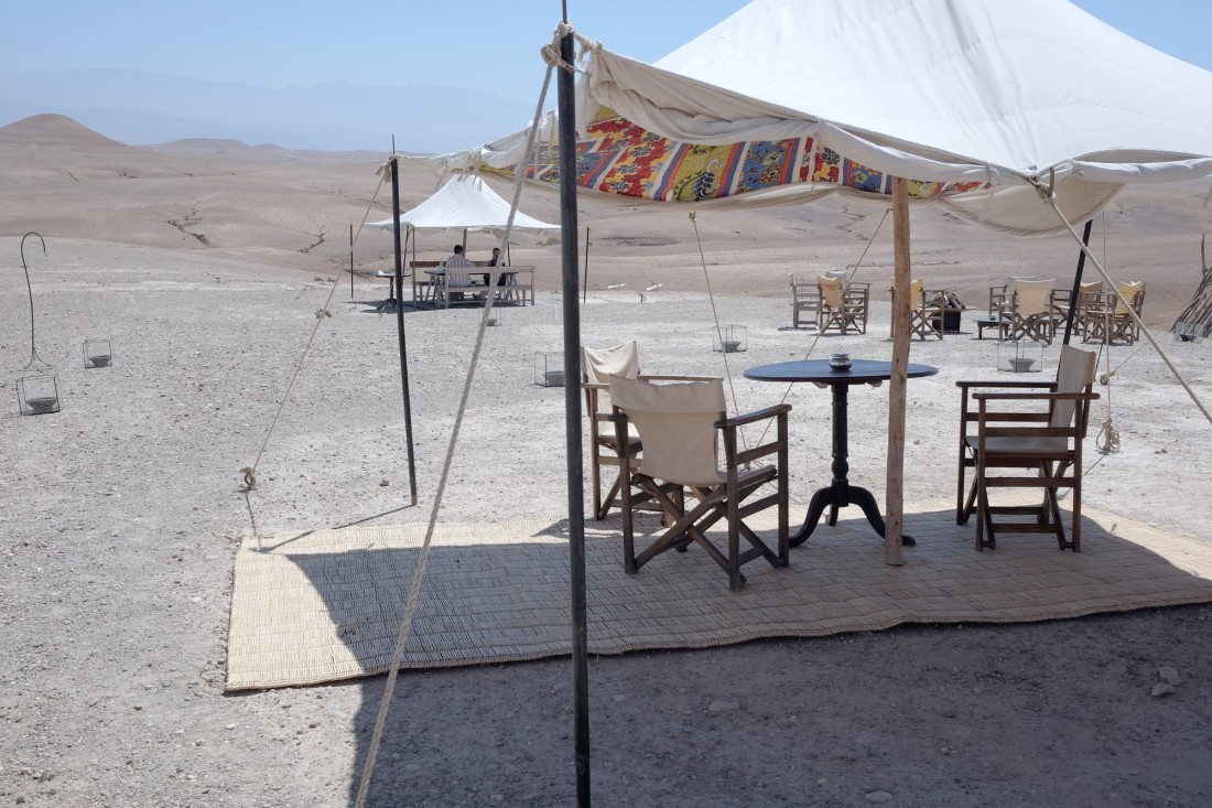 Autre possibilité (et non des moindres !), demander à l’hôtel d’organiser une virée un peu plus au sud vers le Lac Lala Takerkoust et le désert d’Agafay. En 10 minutes de voiture de l’hôtel, on rejoint un loueur de quad… La suite est vraiment démente ! Je suis tombée amoureuse de ce désert, des sentiers plein de poussière, de l’accélération qui envoie du pâté et qui fait patiner le quad dans les montées. L’excursion se solde par un déjeuner dans le désert, sous la tente… Magique.