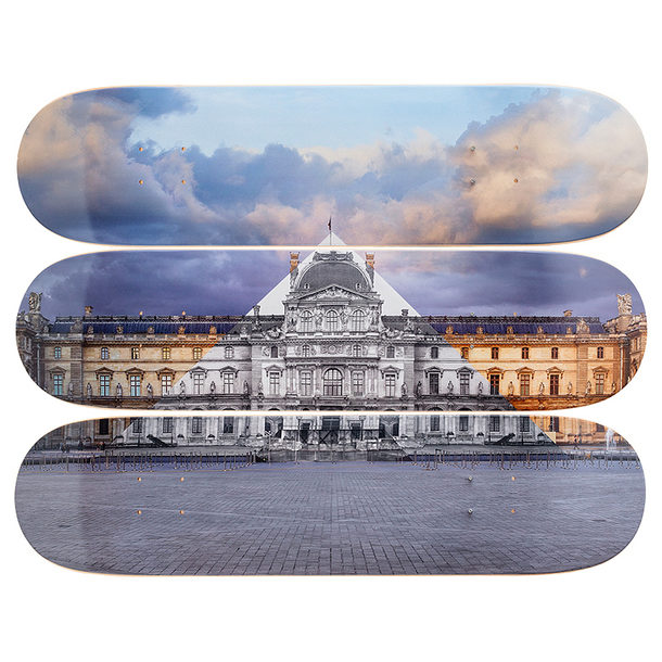 • Skateboards Triptyque JR au Louvre – The Skateroom : un triptyque à accrocher au mur pour célébrer les trente ans du monument. Il y en a 350, ils sont numérotés. En bonus, un pourcentage des ventes sera versé à la Casa Amarela, centre culturel ouvert par JR au sommet de la favela Morro da Providencia à Rio de Janeiro depuis 2009, 750 euros