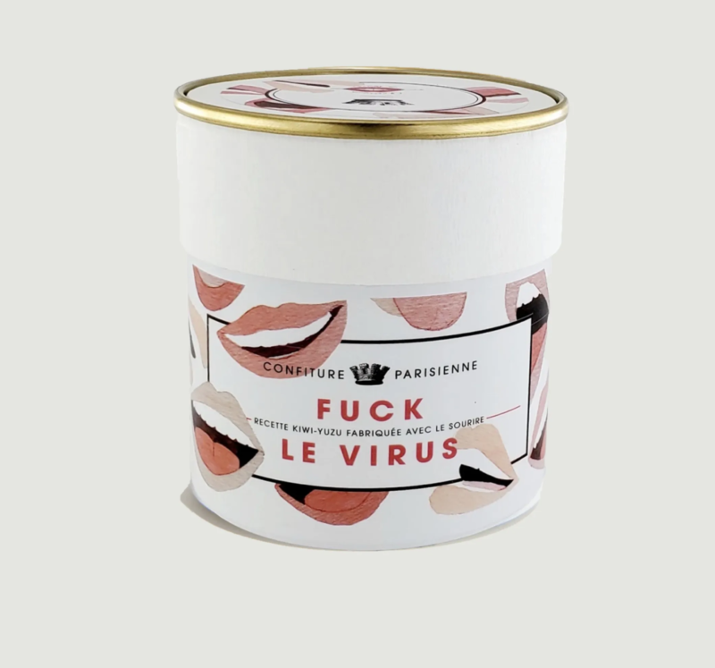• Confiture « Fuck le Virus » des Confitures Parisiennes, parce qu’un peu d’humour ne nuit jamais, n’est-ce pas ?!, 15 euros
