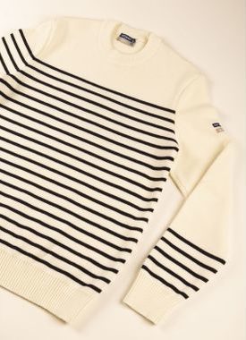 • Pull marin aux rayures déstructurées Saint James x Olow, une jeune marque créateur française, 169 euros