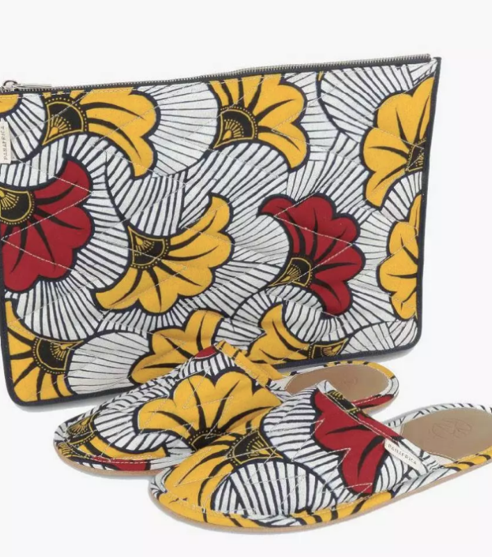- Chaussons en tissu wax et pochette Socco-Fleur Panafrica chez Altermundi**, 65 euros