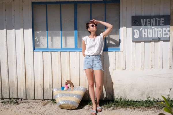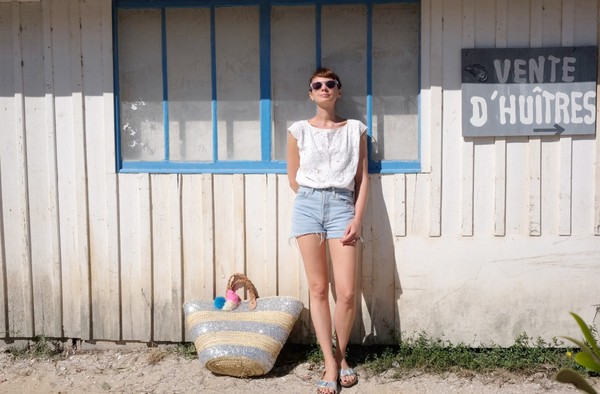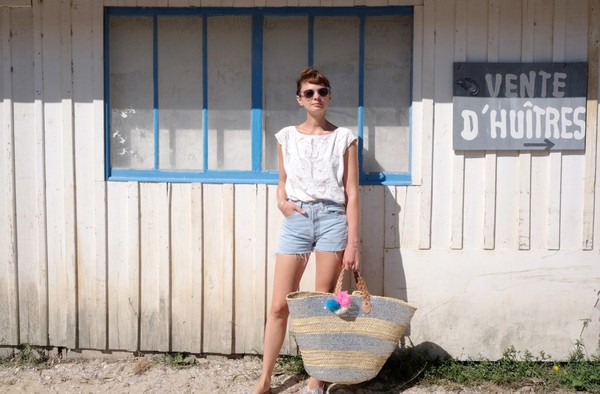 Ce qu’il y a de magique, avec les vacances, c’est que j’embarque toujours 4 shorts, 14 hauts, 6 robes et 18 paires de chaussures. Pour finir avec la même tenue tous les jours. En l’occurrence, ce short d’amour, un Levi’s vintage déniché chez Merci pour la modique somme de 35 euros, et cette blouse que l’on pourrait qualifier de vintage vu que je dois bien la porter depuis au moins 5 ou 6 ans. Ajoutez les fameuses Birkenstock que je n’ai pas quitté de l’été, que ce soit à Paris ou au Ferret, et ce panier tellement HAN déniché sur le marché eh hop, le tour est joué !