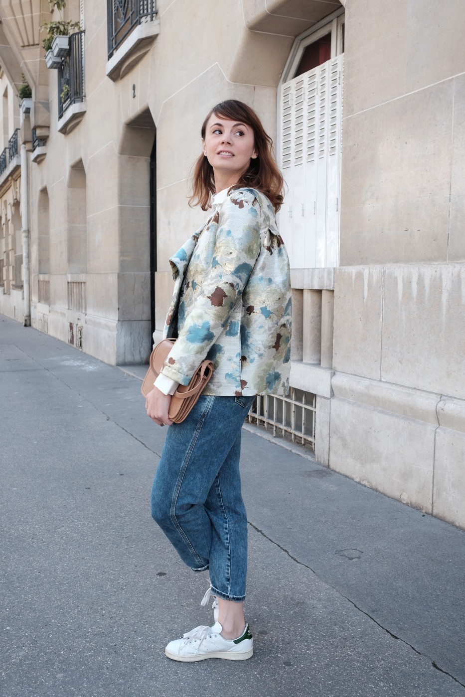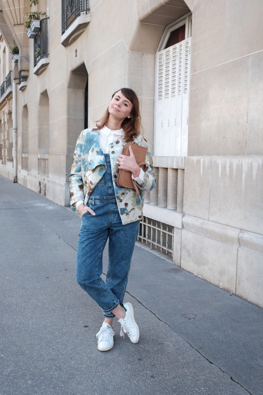 Afternoon Breeze, c’est le joli nom de la marque de la veste que je porte. La marque sort sa 1ère collection, elle est entièrement fabriquée en France. Audacieuse, différente… Je suis amour ! En particulier pour cette veste, donc, pépite de couleurs, matière et imprimé foufous. Portée avec une chemise toute simple pour temporiser, une salopette et des baskets tout ce qu’il y a de plus classique. Ajoutez un sac Talla, la petite soeur de my beloved Velvetine qui propose des sacs en cuirs eco friendly au tannage végétal plus accessibles car vendus essentiellement via l’eshop eh hop, le printemps chante ! (Vous l’entendez ?)