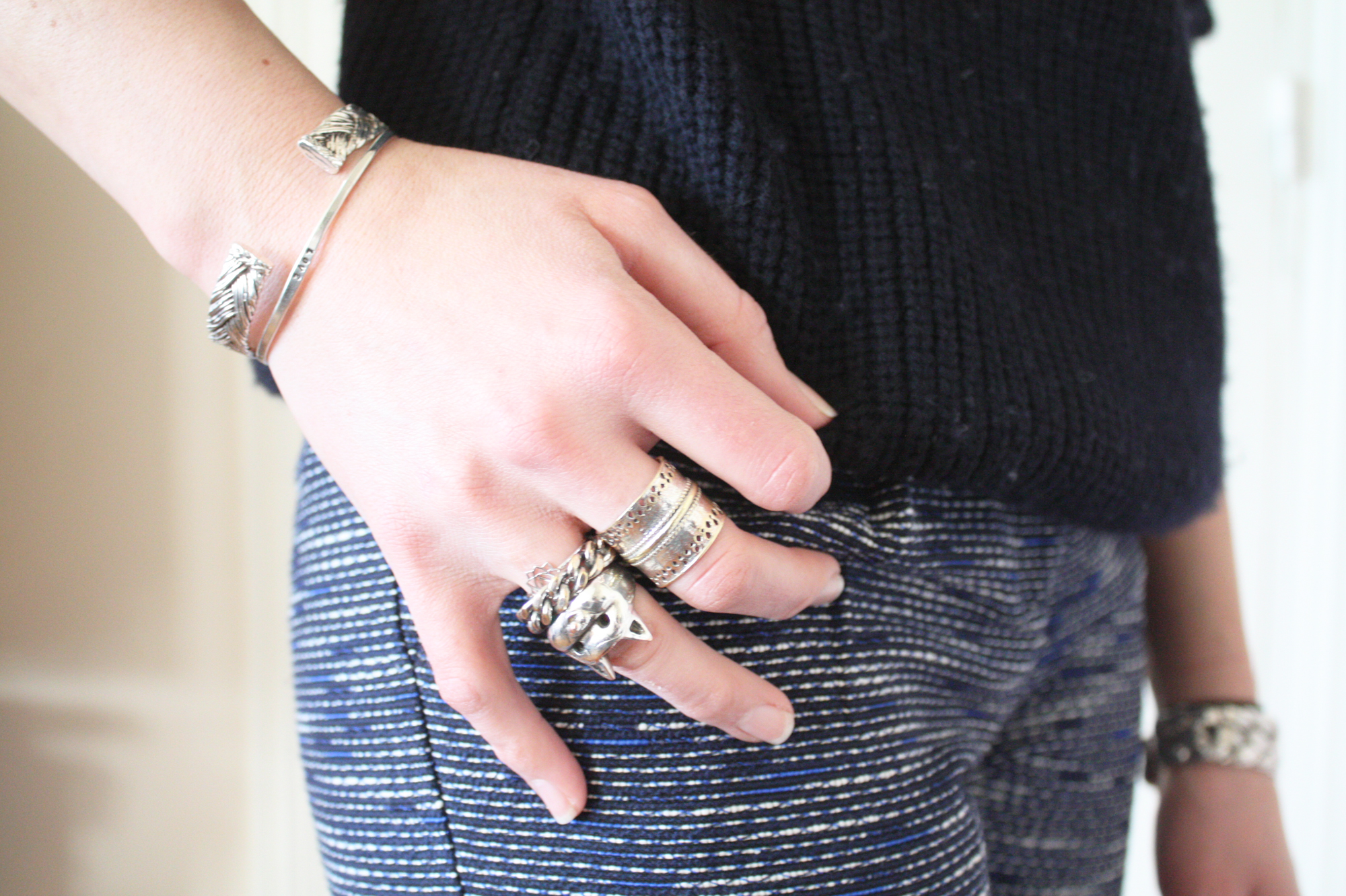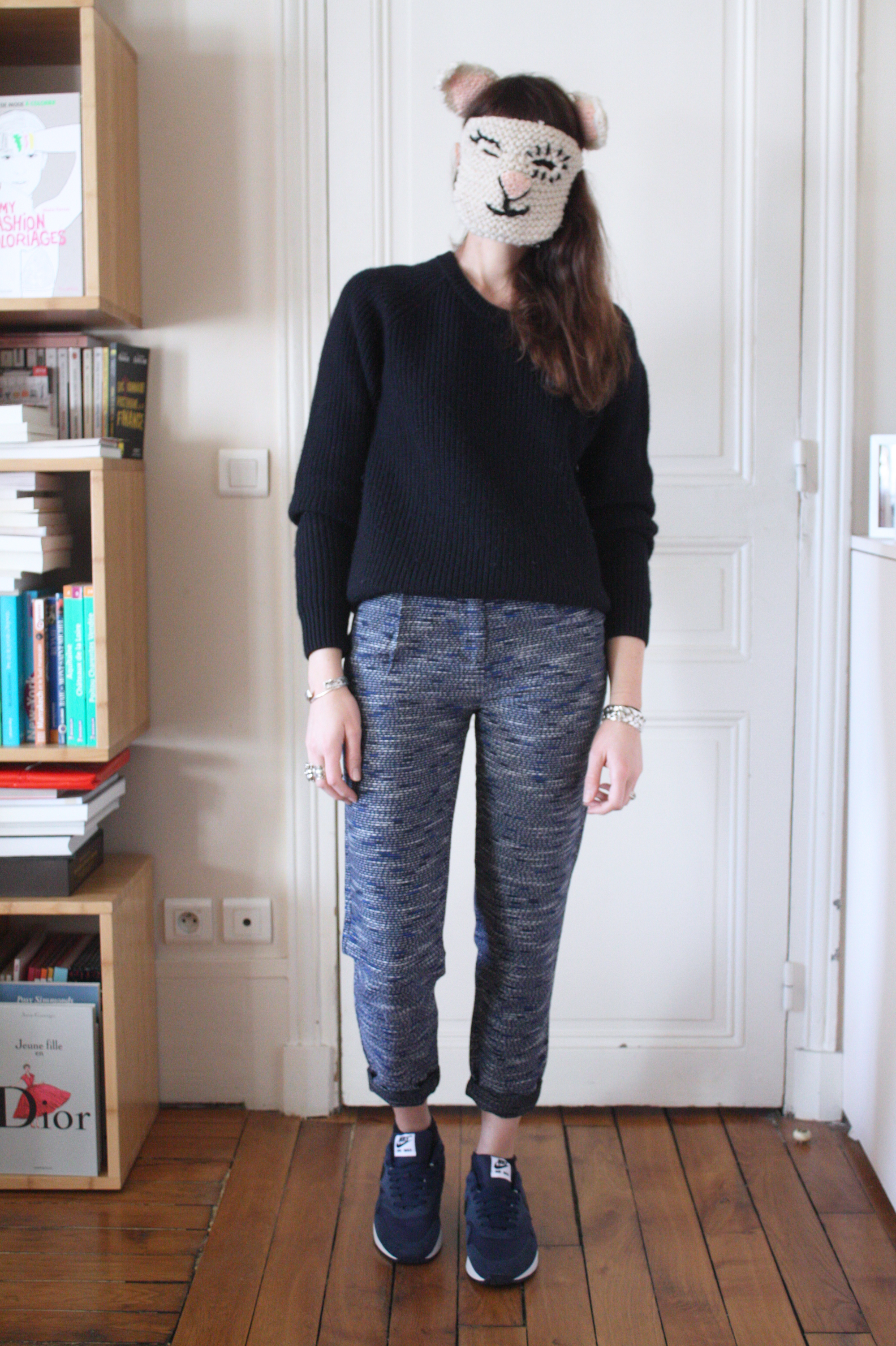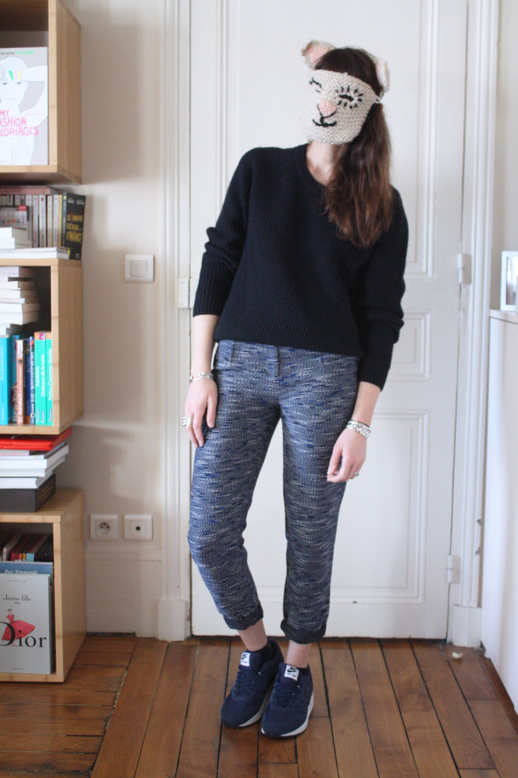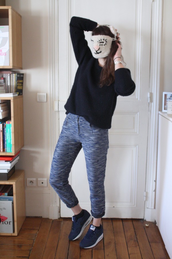 Pull Sandro (hiver 2013 et pas hyper quali, donc) // Pantalon Sessun (été 2014. Pour info, il taille un peu grand, j’ai pris du 34) // Air Max à moi <3 (il faut aller sur NikeID pour personnaliser le modèle de son choix) // Bagues Mademoiselle PierreLeonor MatailletSatellite, Tiny Om et Charlotte Martyr (déjà vue ici ou ) // Bracelets Aurélie Bidermann (les deux joncs tressés) et Serge Thoraval (le love) // Gaston Emmanuelle Esther