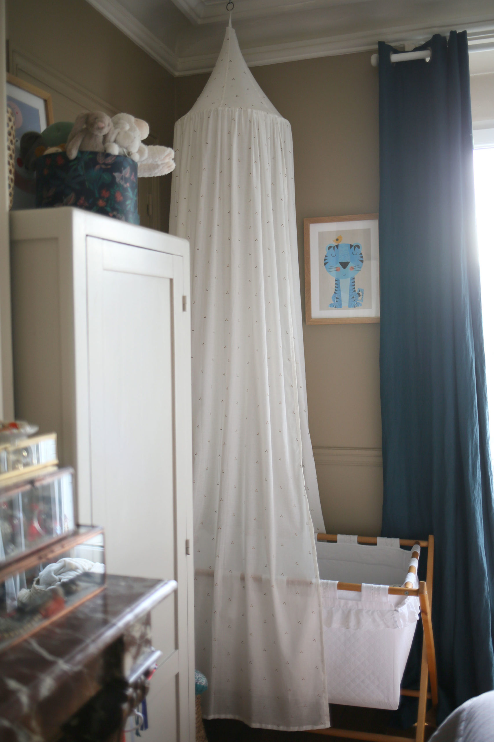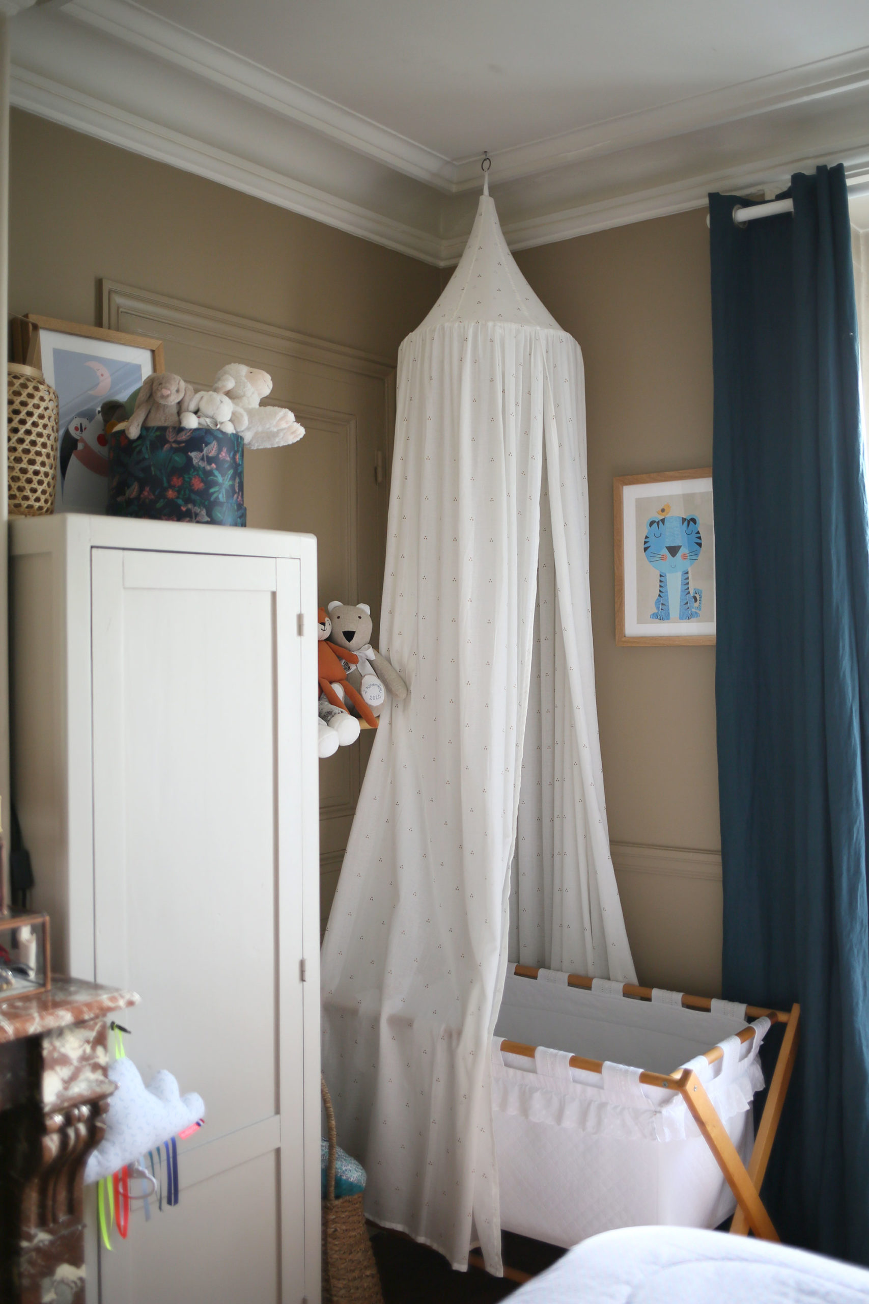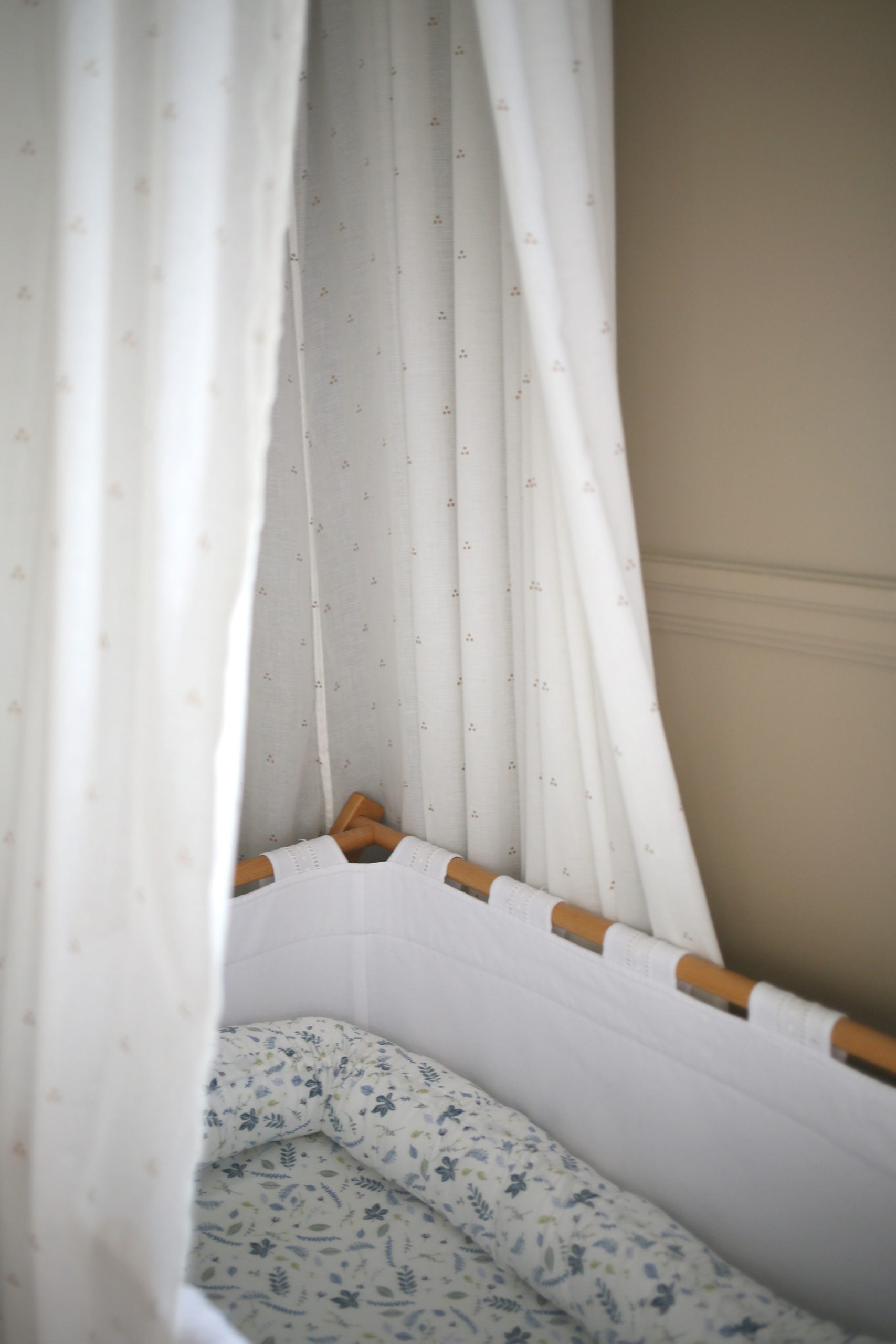 C’est beau, mais pas que : le ciel de lit matérialise son espace, lui (et nous !) assure un semblant d’intimité et l’isole du froid et des courants d’air. Je l’ai choisi blanc avec un motif à pois dorés pour aller avec la peinture et les meubles autour. Il vient de chez Cam Cam Copenhagen, pépite de marque danoise que j’ai découverte il y a quelques mois à peine et que j’adore !