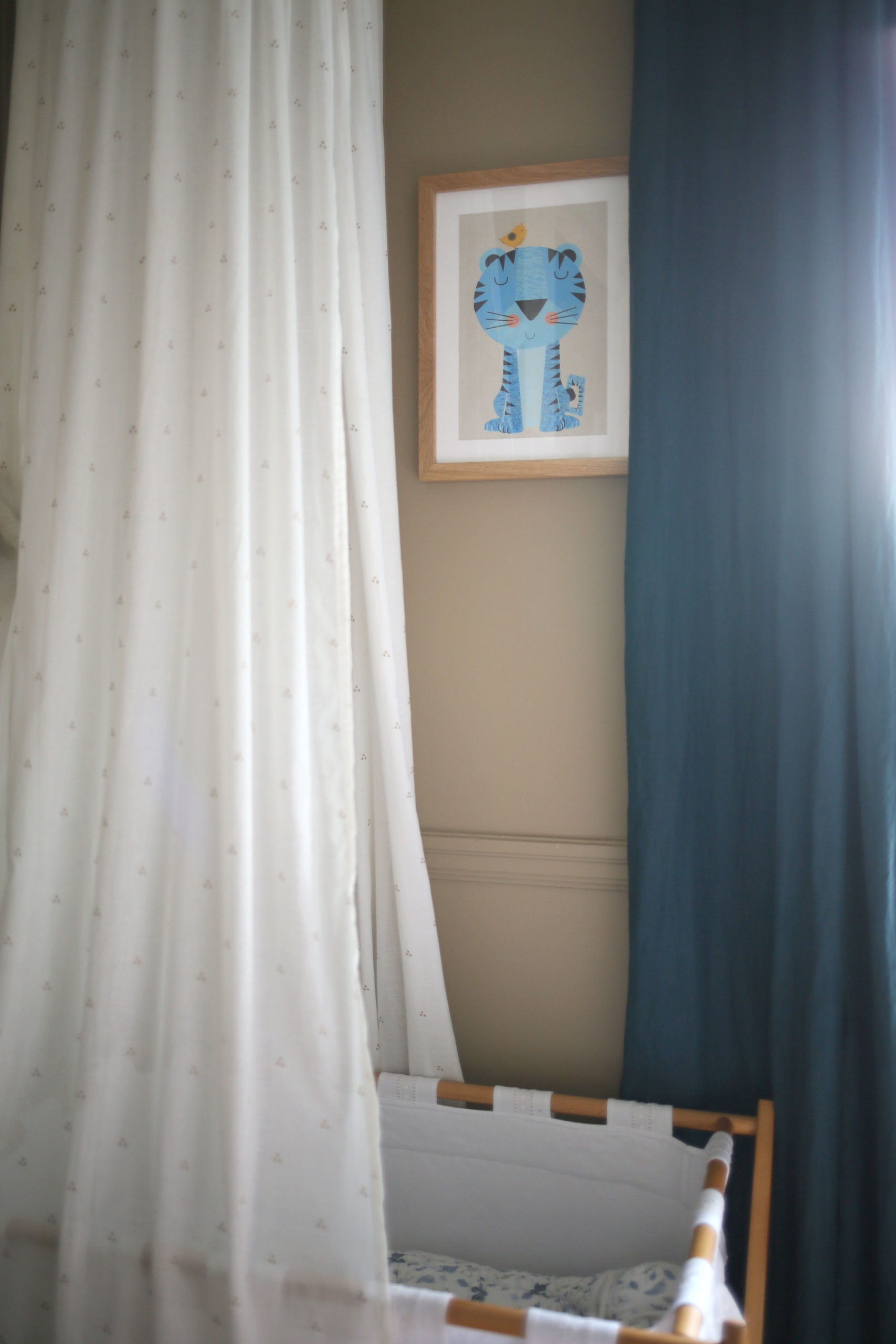 Pour matérialiser son coin chambre, on a peint les deux pans de murs qui lui sont alloués. On a choisi une teinte pas trop marquée pour ne pas avoir à changer les rideaux and co : on a pimpé la chambre il y a quelques mois, l’idée n’était donc pas de tout modifier. On a choisi la teinte « Stone Dark Warm 36 de Little Greene » (qu’on a fait « contretyper », ce que vous pouvez faire dans n’importe quel magasin de bricolage ou chez un revendeur de peinture) (nan c’est pas bien mais j’ai été quelque peu échaudée par la qualité des peintures Farrow and Ball et du coup, j’hésite à mettre le prix dans une peinture chère depuis…!).