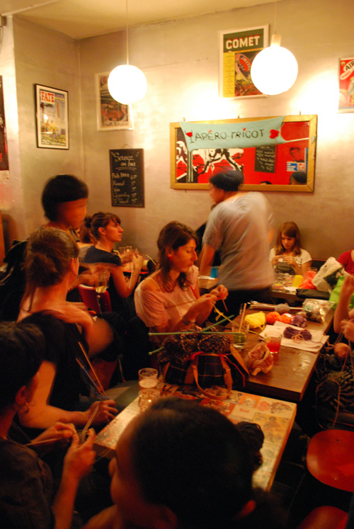 ici en angleterre ca m’est deja arrivé de croiser 2, 3 ou 4 copines ensembles, calées dans les canapés confortables des pubs, autour d’une biere ou d’une bouteille de vin blanc, papotant et … tricotant!