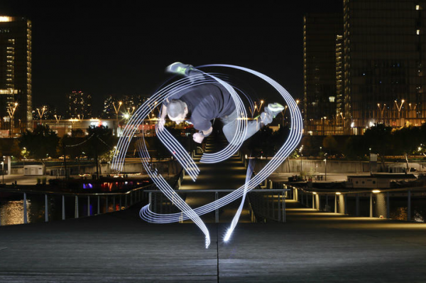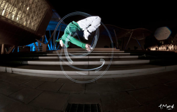 La semaine dernière, je vous présentais Mademoiselle Maurice et ses origamis incroyables qui essaiment sur les murs et changent notre vision de la ville. Pour ce deuxième épisode d’Art de la Ville, smart a donné la parole à Tim Marsh. Un artiste pas moins talentueux qui mixe lightpainting et sports de rue et qui, là encore, offre une nouvelle perspective à notre environnement. Sa discipline, si elle est bien différente de celle de Mademoiselle Maurice, n’est pas moins dépourvue de poésie. La preuve avec ces clichés (accrochez-vous !) :