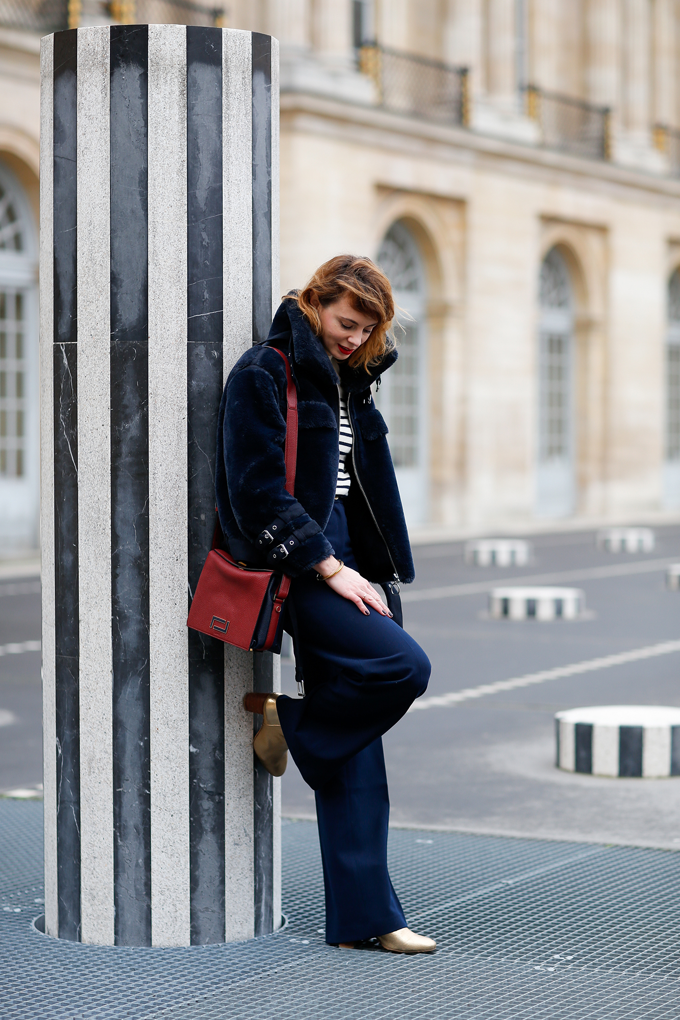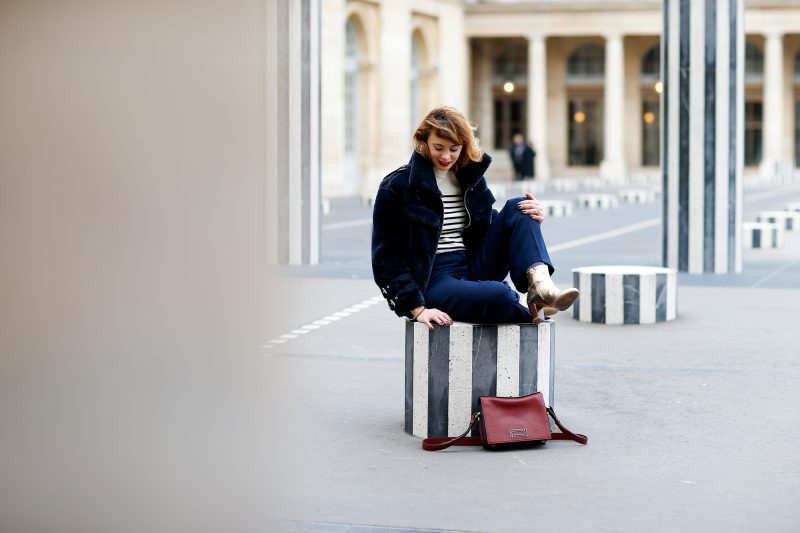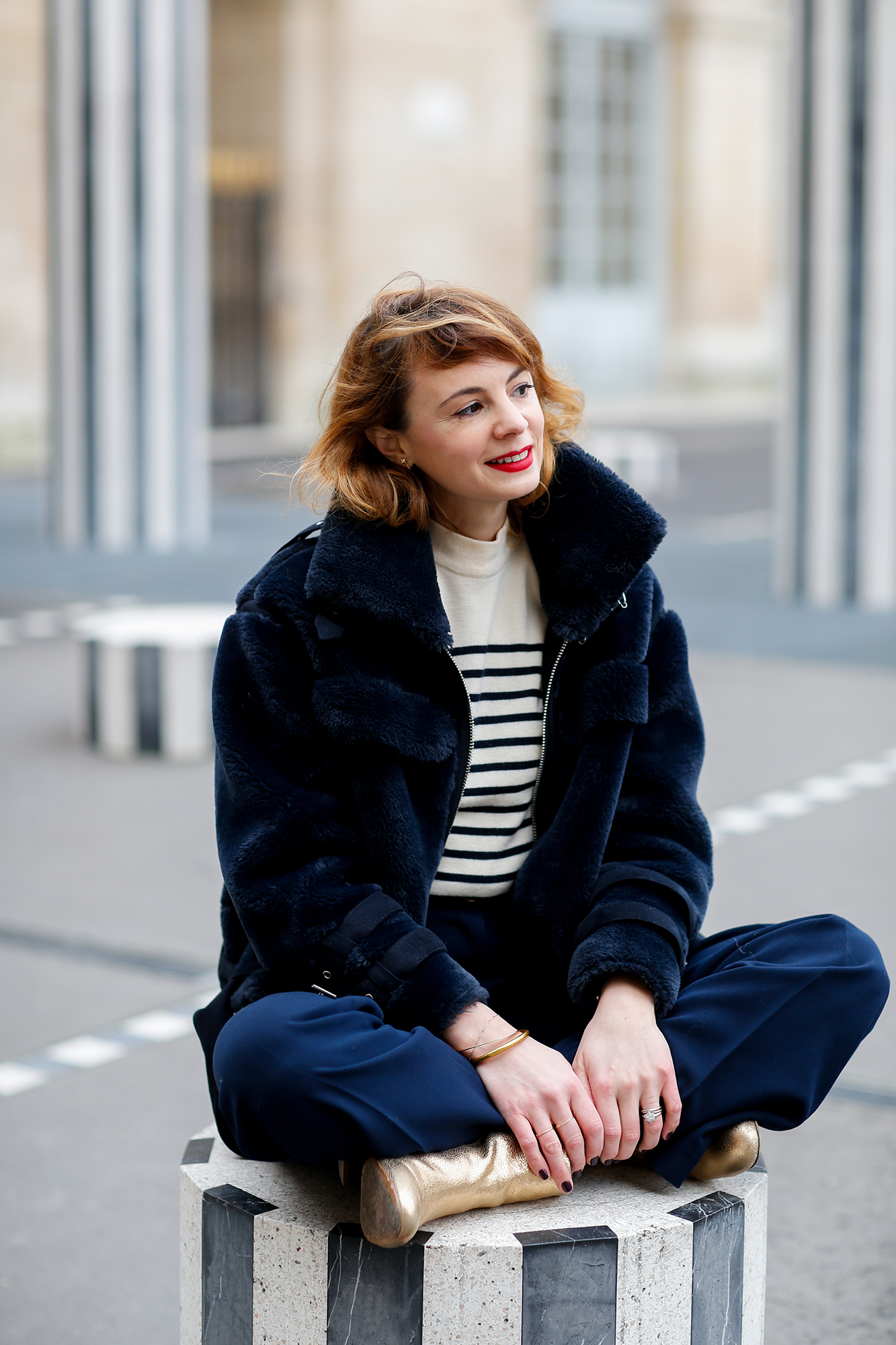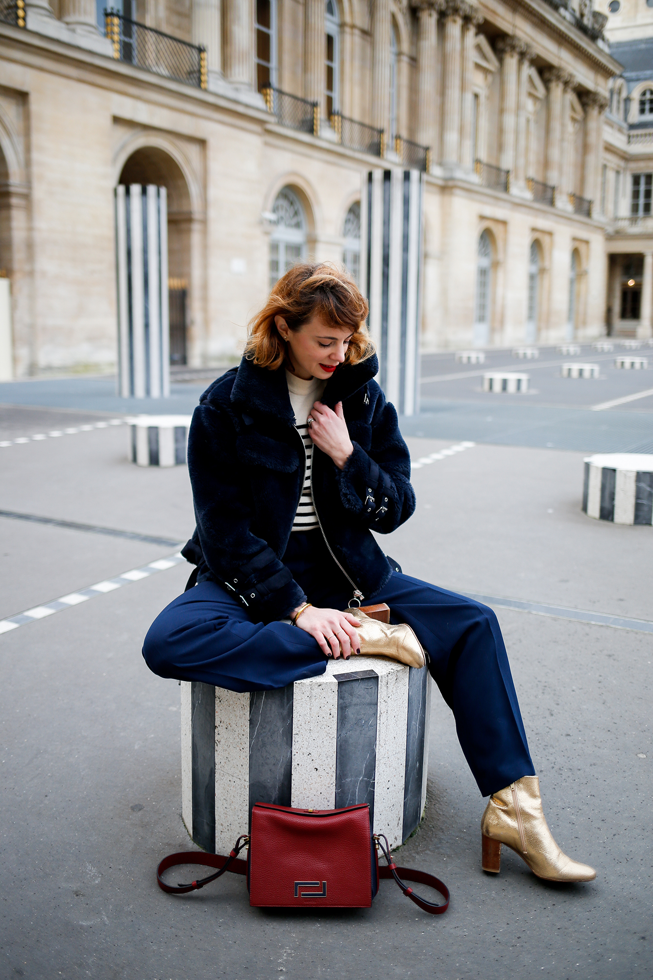 Blouson Eleven Paris I Pantalon Max & Co I Sac Lancel (déjà vu ici) I Bottines Sézane (déjà vues ) I Marinière Saint James (increvable, malgré le passage à la machine pas plus tard que la semaine dernière…) I Bracelet tibétain et Monsieur Paris