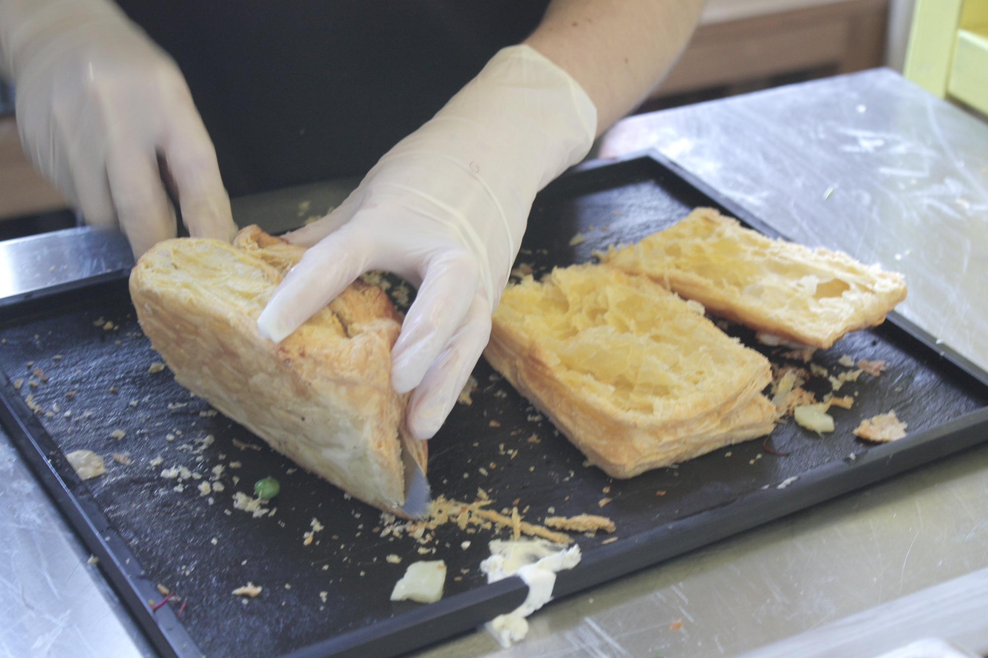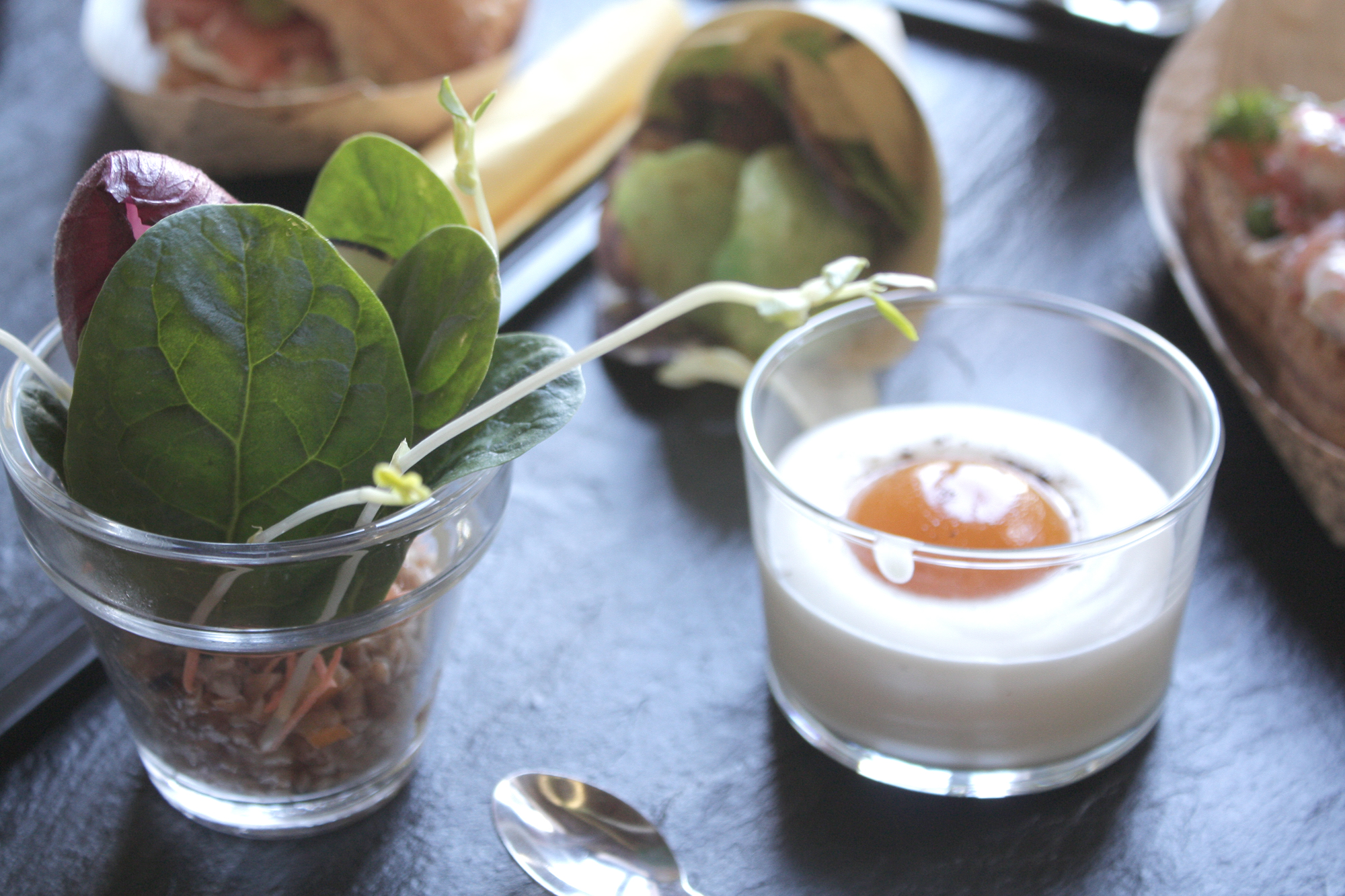 Et puis, il y a l’assiette. Au fond du foyer, les plats sont préparés dans une sorte de carriole sympathique. Là, une équipe s’affaire pour composer le menu unique du brunch. Ce jour là, il était composé de chips de légumes assez dingues (je crois même que certaines étaient au Wasabi, mais je n’en suis pas sûre), d’un feuilleté saumon-crevettes-concombres à se pâmer (même si le feuilleté était un peu sec, mon seul bémol en tout et pour tout), d’une petite salade de boulgour à l’orange (vraiment dingue). Pour finir, une pannacotta à l’orange (non, ça n’est pas un oeuf cocotte que l’on voit sur la photo !) et une tarte pamplemousse caramel ravissent nos papilles…. Autant que nos pupilles !