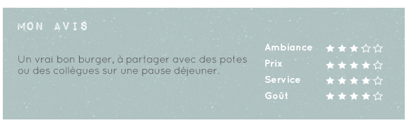 C’est bon, ludique, sympathique et pas hors de prix. Comptez 12,50 euros pour un menu déjeuner comprenant un burger, des frites et une boisson.