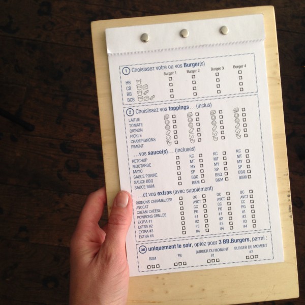 Et puis, surtout, il y a le concept du burger entièrement réalisé sur-mesure. Pour ce faire, on attrape un crayon et la grille magique mis à notre disposition sur le bar, et c’est parti. Type de burger, toppings (laitue, tomate, piment, pickle…), sauces, extras… ce sont des dizaines de possibilités qui s’offrent à nous pour composer notre burger à nous.