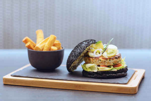 Bun à l’encre de seiche, langoustines au couteau et bar, pickles de concombre, salade d’herbes, tomates cerises, segment de citron, oignons caramélisés, sauce tartare et purée de poivrons.