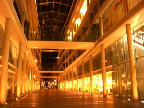 J’aime particulièrement celle-ci, parce qu’elle est un peu floue, peut-être. Ou peut-être parce que les lumières dansent gaiement au milieu de cette cathédrale de verre étrangement vide et lumineuse. Ou peut-être, encore, parce que les couleurs qui s’en dégagent sont d’une douceur inouïe. Bon, d’accord, le fait que j’ai pris cette photo en sortant d’un restaurant où j’avais passé la soirée avec deux très bonnes amies n’est certainement pas pour rien dans le fait que je l’aime bien, je vous l’accorde. Et cette gaité ? fleur de peau ne m’empêche pas de trouver cette photo un brin mystérieuse…