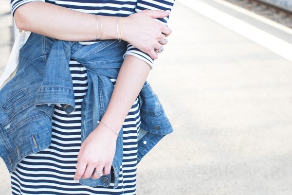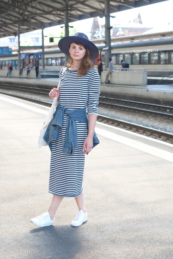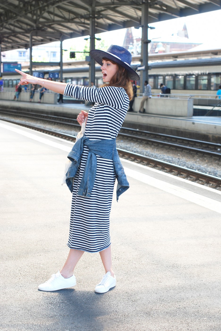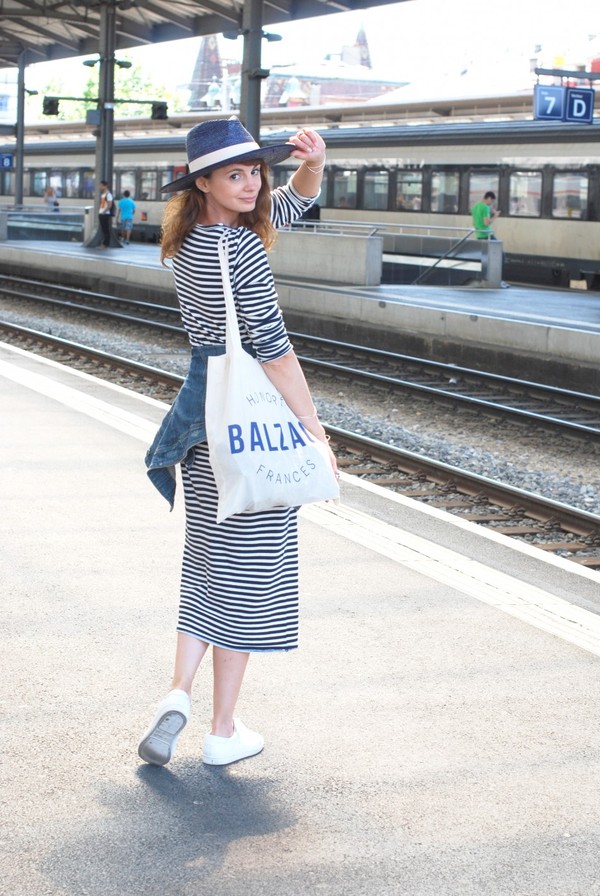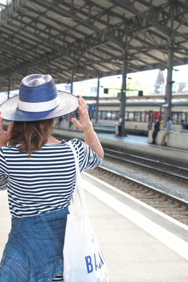 Avant le compte rendu de ce week-end au Montreux Jazz Festival, donc, un look, shooté au débotté sur le quai de la gare de Lausanne. Ma tenue favorite du moment, je crois. Parce qu’ultra confortable, parce que facile à vivre, parce que la marinière. Et ce chapeau, repéré à Calvi sur la petite tête blonde d’Elsa et aussitôt adopté… Bêêêêêê !