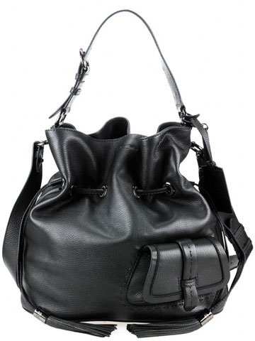 Je pensais avoir déjà fait une photo avec et puis non. C’est un sac seau, tout bête. Cuir noir grainé, épais. Hop =