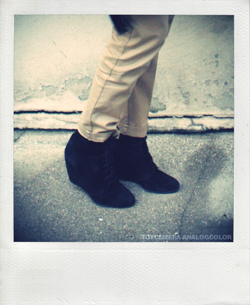 j’aime beaucoup les compensées! En daim noir, elles permettent des hauteurs folles, et en même temps, en toute discrétion!