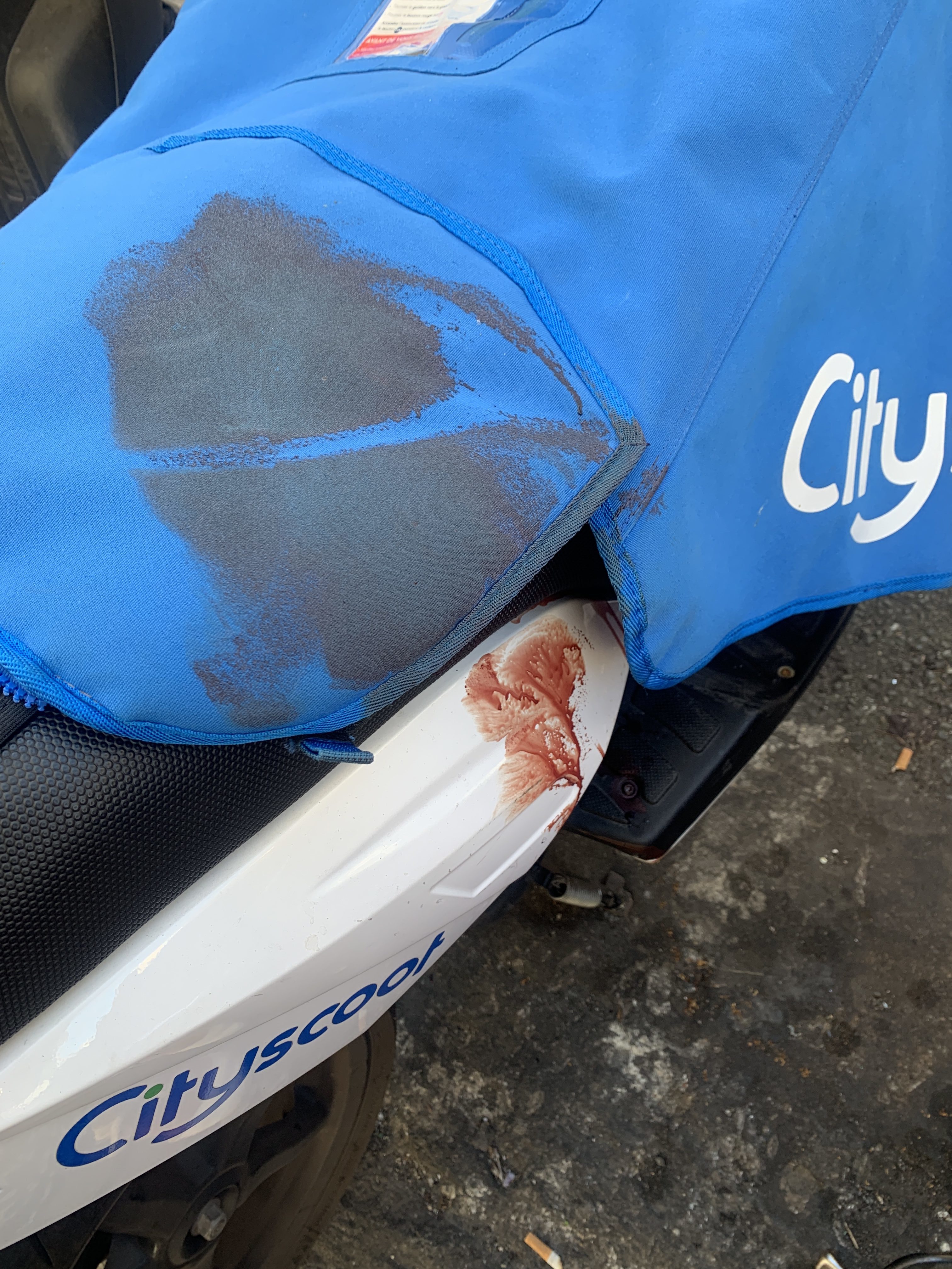 18h06. Je suis devant le scooter. J’hésite pas pleurer ou à vomir… il est couvert de sang. La preuve : (je l’ai mise en tout petit pour éviter de choquer les âmes les plus sensibles)