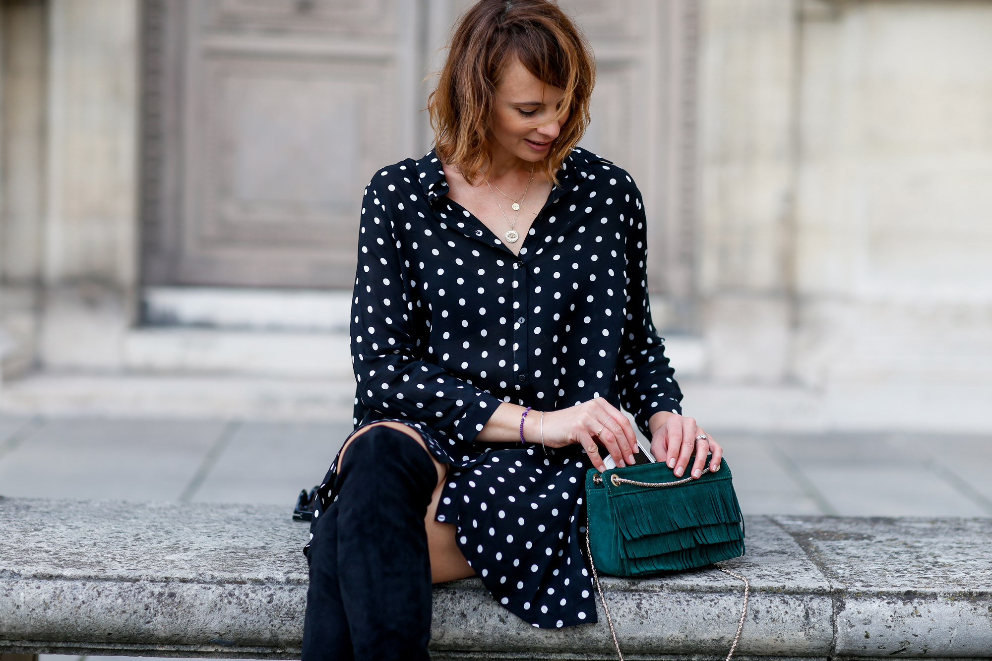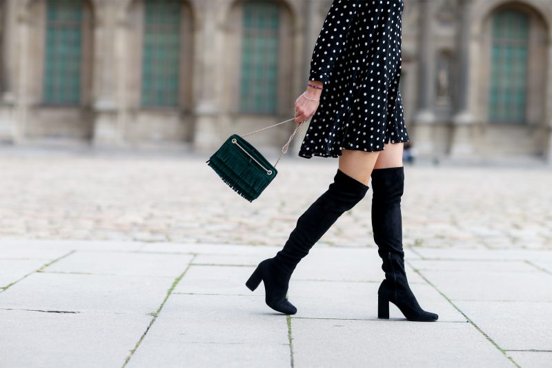 J’ai toujours bavé devant les cuissardes sans jamais oser franchir le cap. Sur les autres, je trouve ça divin. Sur moi, évidemment, je trouve ça vulgaire et déplacé. J’avais donc peu ou prou lâché l’affaire… C’était sans compter sans l’ami espagnol si prompt à copier toutes les tendances du marché qui, vers la fin de l’été, a dégainé ces pépites là. Talons pas trop hauts, bouts légèrement arrondis, tiges molles qui retombent joliment sur les jambes… Trois clics plus tard, elles étaient dans mon panier, avant d’être à mes pieds !