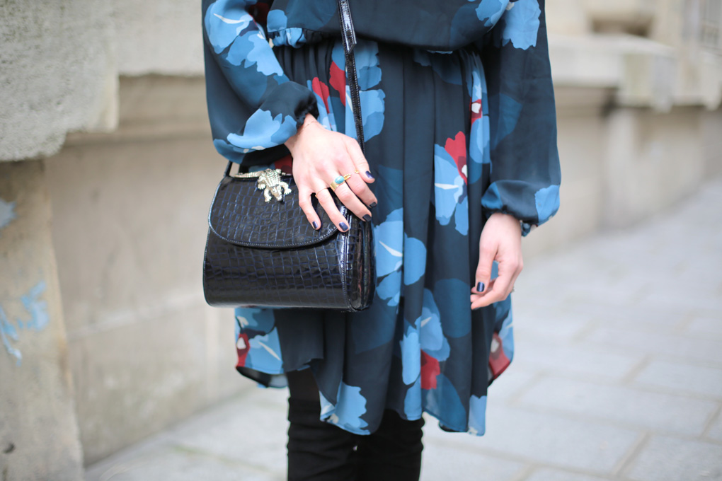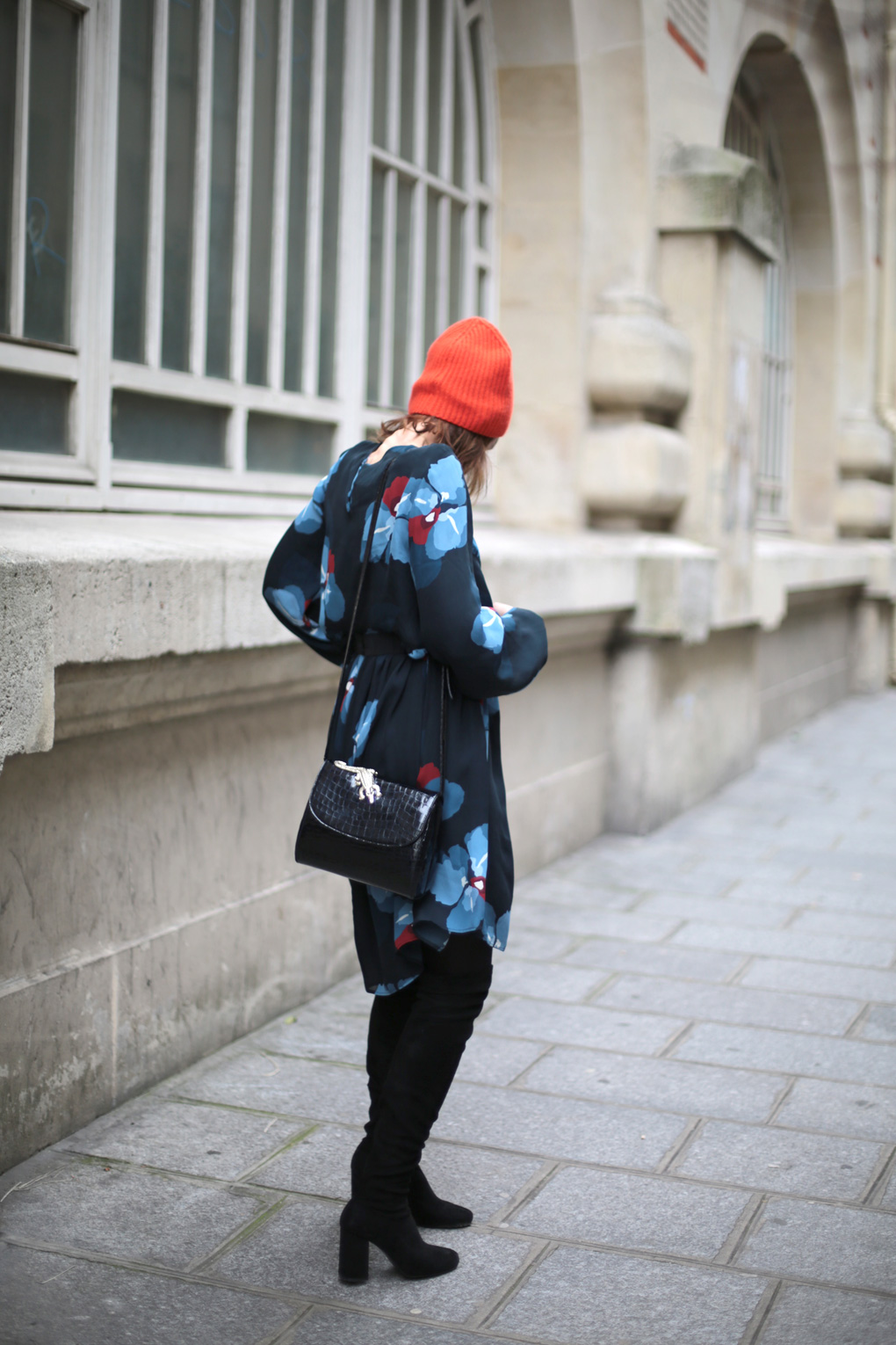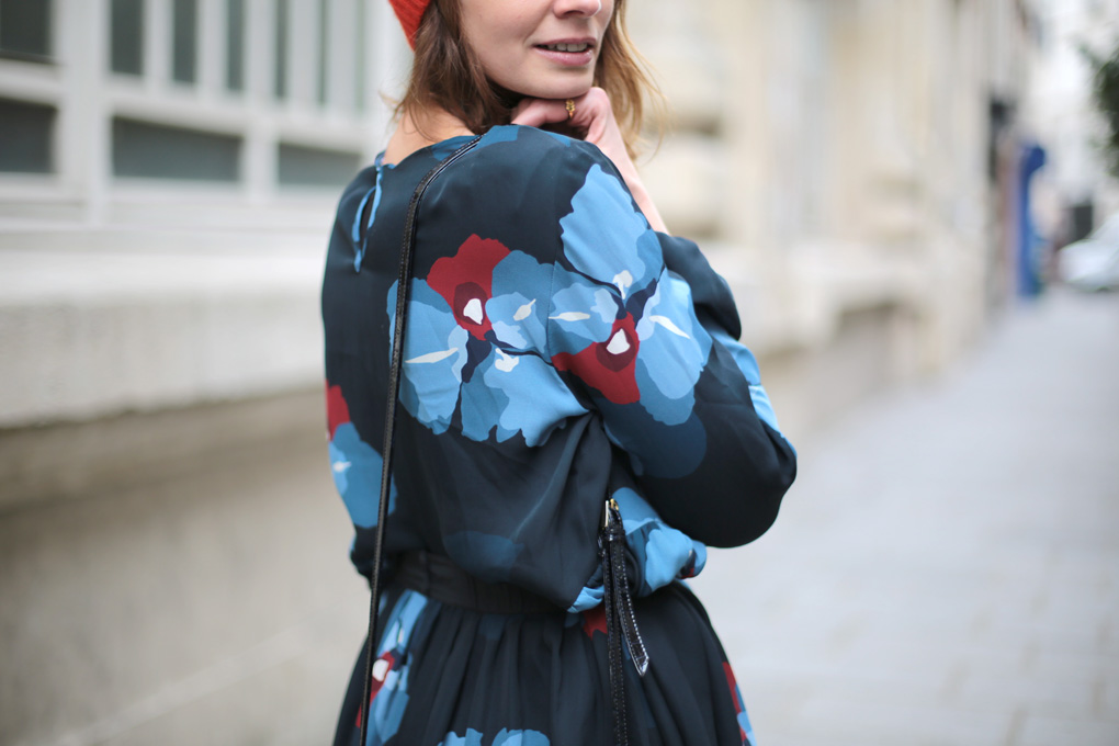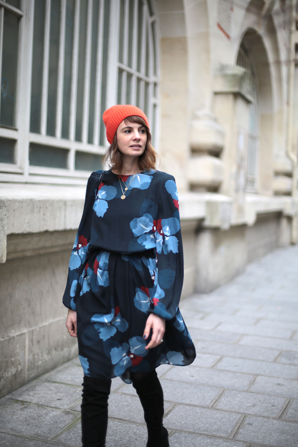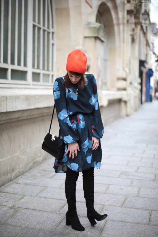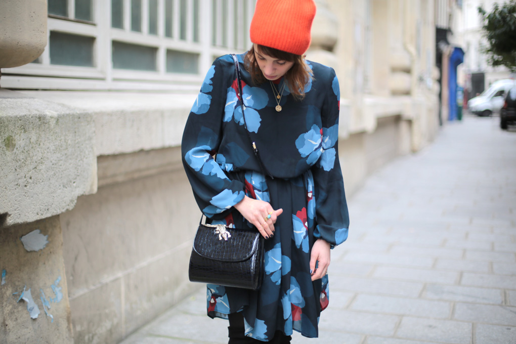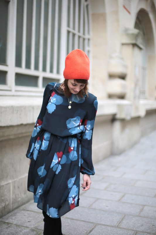 Or donc, l’hiver ayant tendance à me déprimer un brin, j’ai dégainé ma solution ultime : des fleurs et des couleurs. La robe est archi légère, certes, mais archi jouable avec un bon gros Heattech, des collants bien épais et des cuissardes. Elle est très fluide aussi, ce qui en fait l’alliée parfaite pour les raclettes (ou les pizzas énoooormes qu’on venait d’engloutir Daphné, Emilie, Fanny et moi au délicieux Big Love) (Bien sûr que j’ai entré l’adresse dans mon Mapstr !). Le bonnet rouge, quand à lui, est la meilleure des solutions pour lutter contre le teint en berne et les petites nuits : je n’ai pas trouvé mieux pour raviver le teint l’air de rien, pas même le trait de rouge à lèvres !