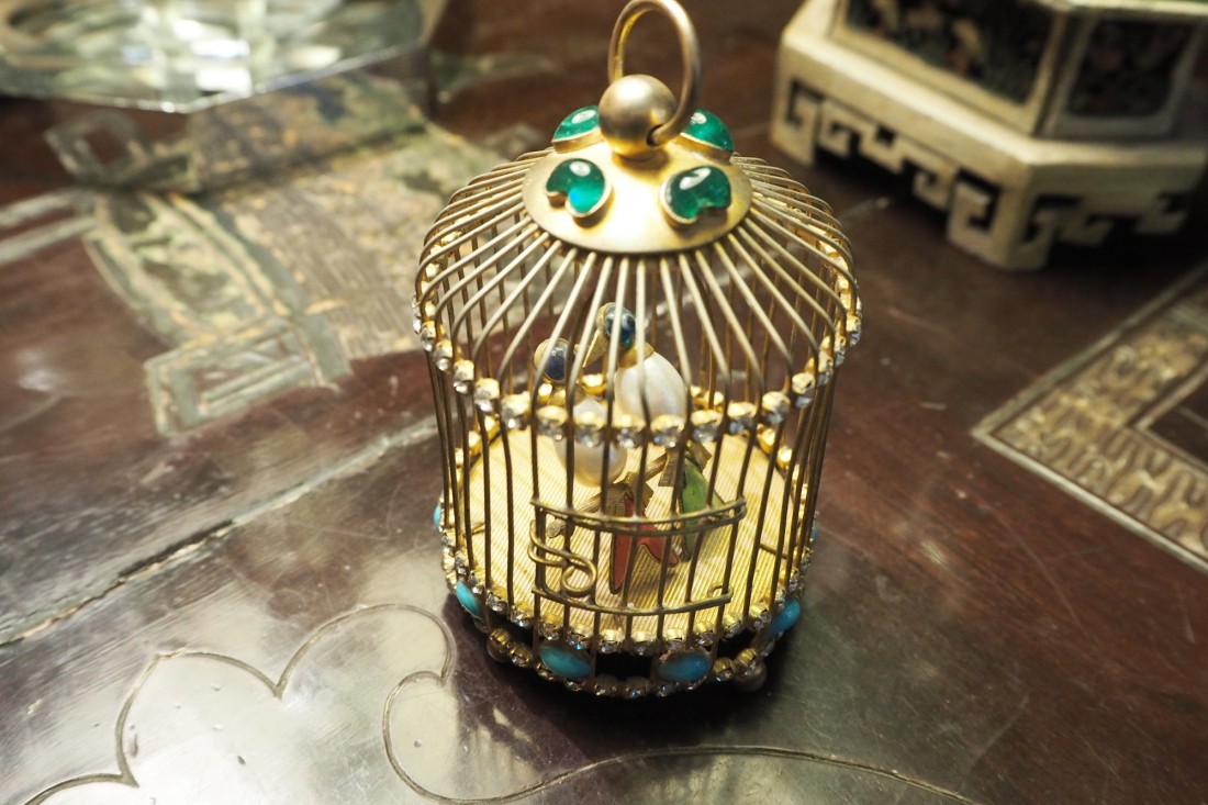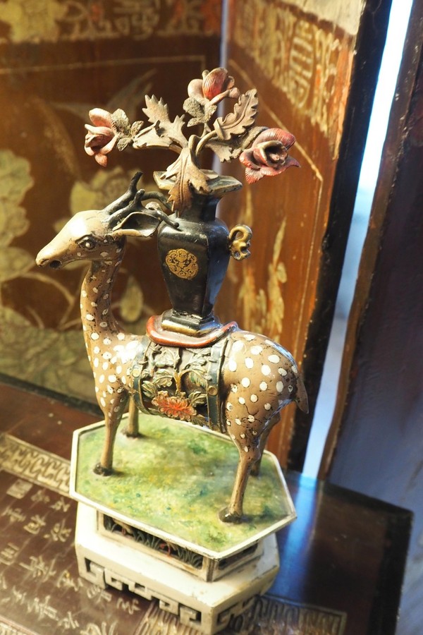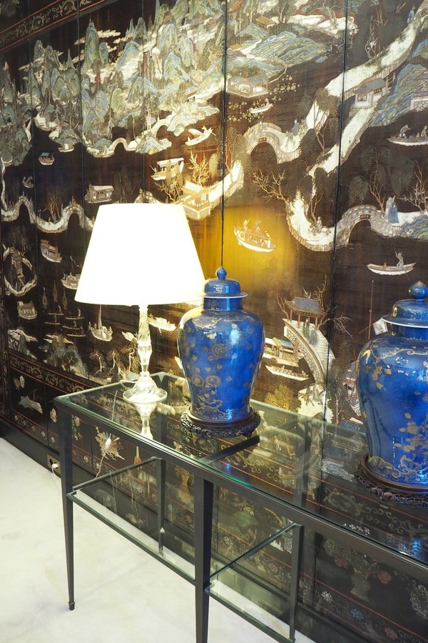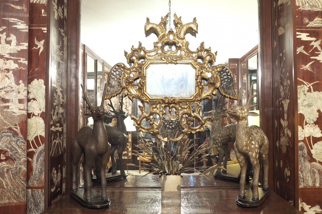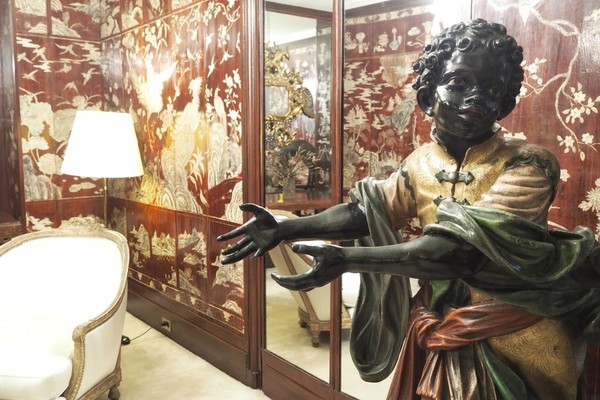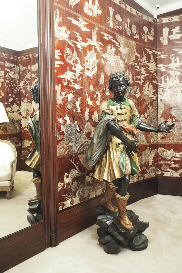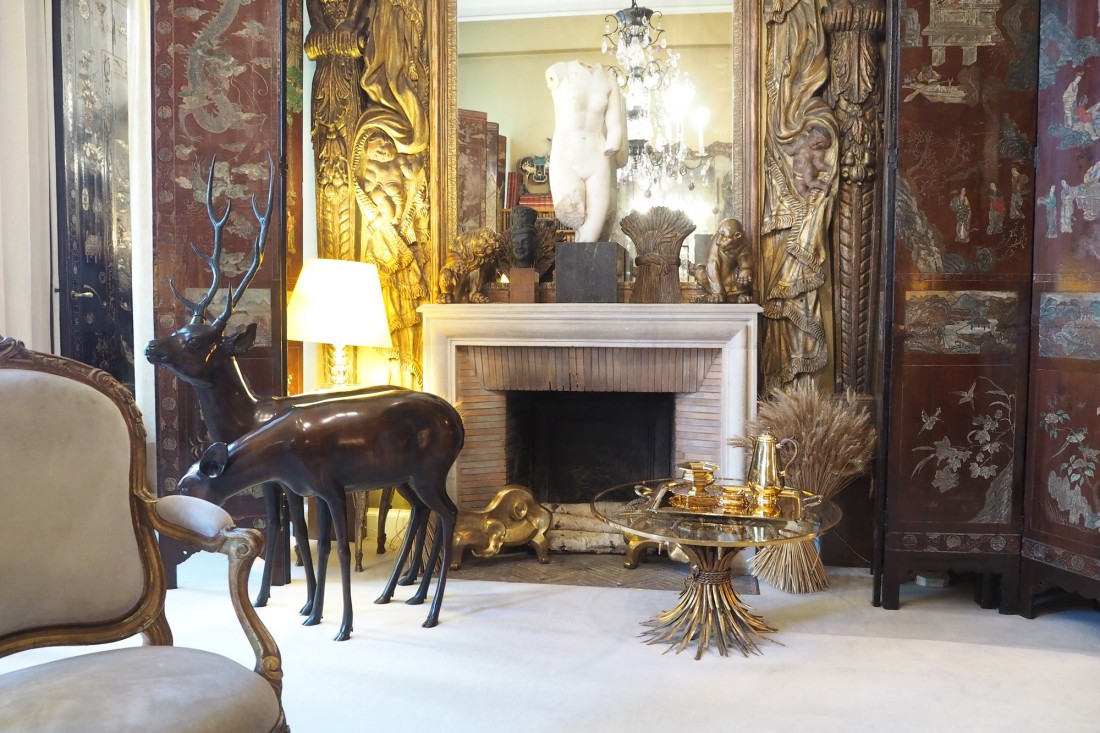Une statue accueille le visiteur et le plonge dans une entrée aux murs tapissés de paravents sur lesquels s’épanouissent des fleurs de camélia, l’emblème des dandys que Gabrielle déclinera ensuite en bijoux.