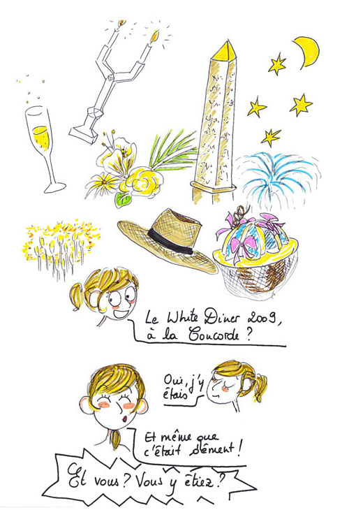 Figurez vous que cette année, j’ai assisté pour la première fois à ce fameux dîner en blanc et qu’en plus on m’a demandé d’être "rallieuse" et bizarrement je ne suis ni aristo, ni pétée de tunes (mes parents non plus d’ailleurs …) et qu’à ma table mes convives étaient de tous les styles, de tout les milieux, de toutes nationalités et de tous les métiers (comédien en devenir, juriste, éditrice, étudiant, brocanteur, graphiste, chômeur,…) bref, j’ai passé un super moment entourée de mes amis et de milliers de personnes toutes de blanc vêtues et heureuses d’être Place de la Concorde pour vivre ce moment euphorisant et bon enfant …