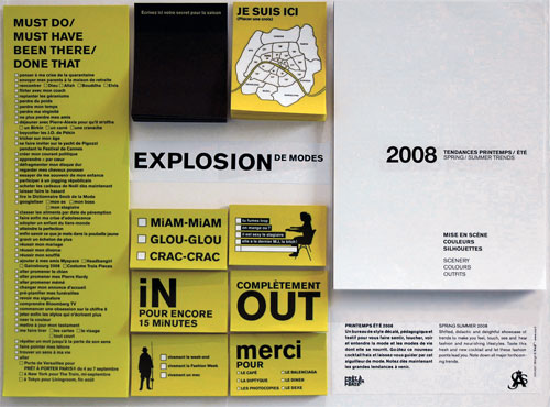 En attendant, voil? un « livre », ou plutôt une planche que j’ai vue sur le site de Prêt-? -porter Paris et qui me plait éminemment. J’adore le concept : un agrégat de post-its pour ce prononcer en faveur ou non des prochaines tendances, des post-its abscons « In pour encore 15 minutes », « vivement le week-end, vivement la Fashion Week, vivement un mec », « miam-miam, glou-glou, crac-crac » et autres fondamentaux. A côté des post-its, un petit cahier détaillant les silhouettes, les couleurs et les tendances Printemps/Eté 2008. J’avoue que je suis absolument fan de ce concept totalement décalé !