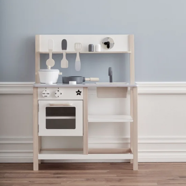 - Une cuisine en bois*, il en existe à tous les prix et de tous les styles. J’ai trouvé la mienne, une IKEA, dans un groupe Facebook…! Evidemment, on peut compléter après avec moult accessoires, des fruits et légumes à couper aux petites batteries de casseroles en passant par les gants et tabliers.. Ce sont autant d’idées cadeaux qui peuvent venir compléter une pièce majeure au fil des Noëls, anniversaires et autres événements.