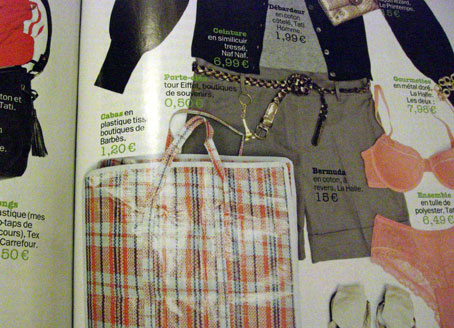 Or, qu’ai-je vu cette semaine en dégustant comme il se doit mon Cosmo ? Je vous le donne en mille : LE cabas. Celui l? même qui fait couler tant d’encre. Mais attention, je n’ai pas vu le cabas Vuitton, que nenni !!! Si vous lisez le petit texte qui accompagne la photo, vous pourrez constater qu’il est écrit « Cabas en plastique tissé, boutiques de Barbès, 1,20€« . Ah !!!! On fait moins les malins hein tout de suite ?!!