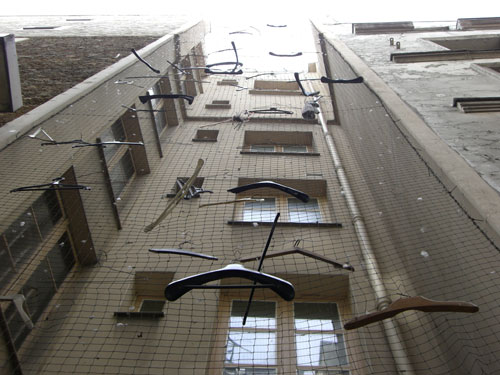 Moi ce que j’aime ? Paris, ce sont les idées complètement saugrenues qu’ont parfois les gens. Tenez, l? , par exemple : un filet est dressé entre deux murs, abritant une petite cour intérieure. Et qu’y a t’il sur ce grillage ? Ben oui, des cintres, je vous le donne dans le mille. Première question : pourquoi diantre ces cintres ont-ils été placés l? ? Deuxième question : et surtout, comment ? J’imagine bien la scène, des habitants de l’immeuble jetant leurs cintres ? toute volée par la fenêtre en prenant bien soin de viser le grillage. Sauf que les cintres sont ? l’extérieur… Ils auraient donc été jeté depuis la rue… Bizarre…