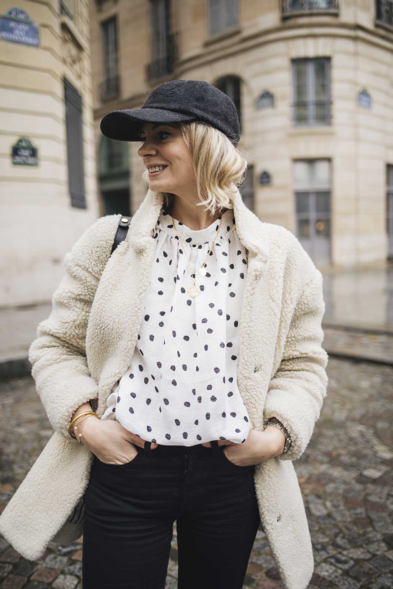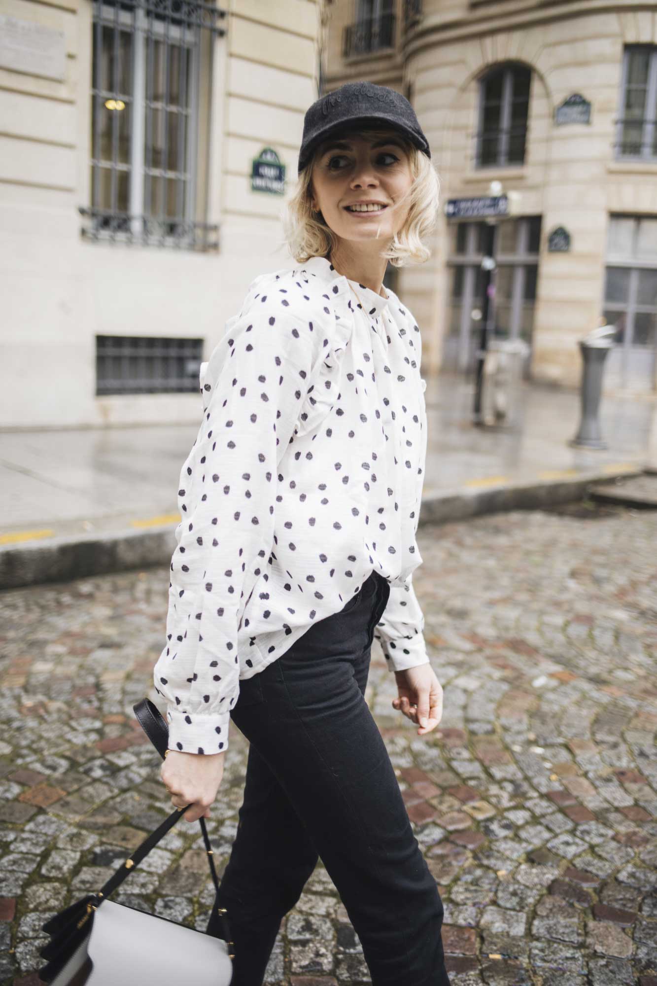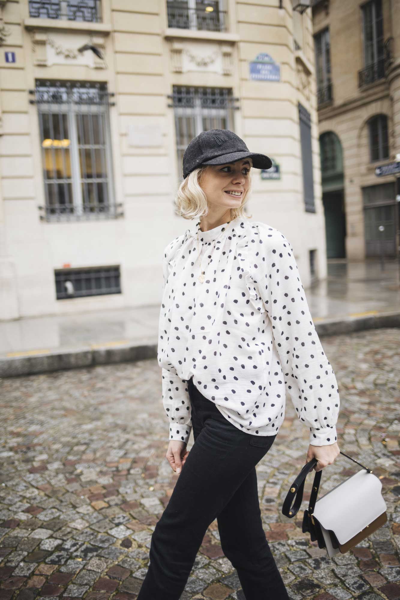 En matière de basiques j’aime à penser que s’il existe une sorte de « tronc commun » de basiques (la petite robe noire, la chemise blanche, le jean brut coupé droit, etc…) et des basiques plus, disons, personnels. La blouse / chemise à pois, par exemple, est l’un de mes basiques à moi. Sur une tenue archi simple comme celle-ci, elle permet d’apporter une petite touche de fantaisie en deux temps trois mouvements. Eh hop, le tour est joué !