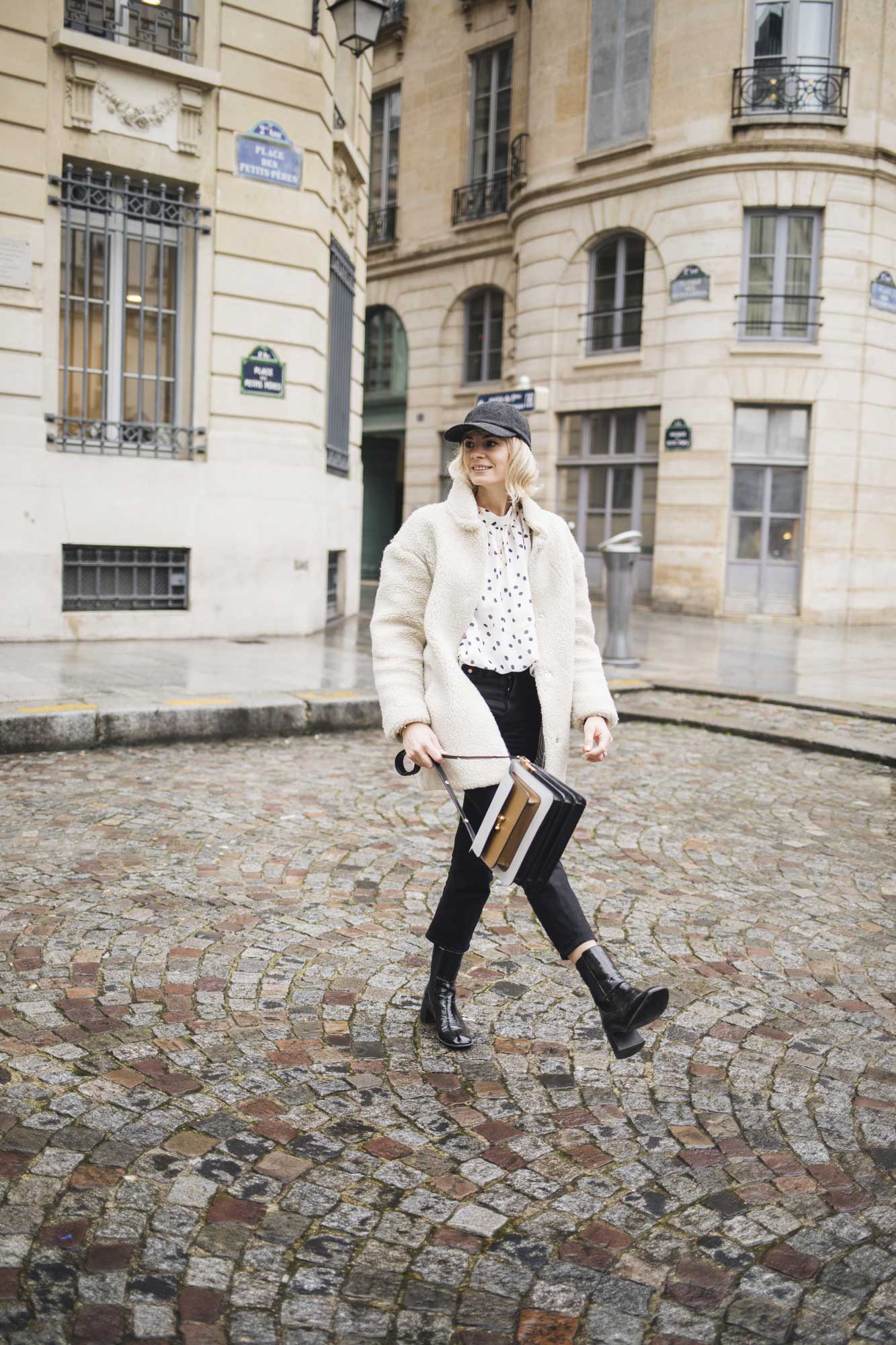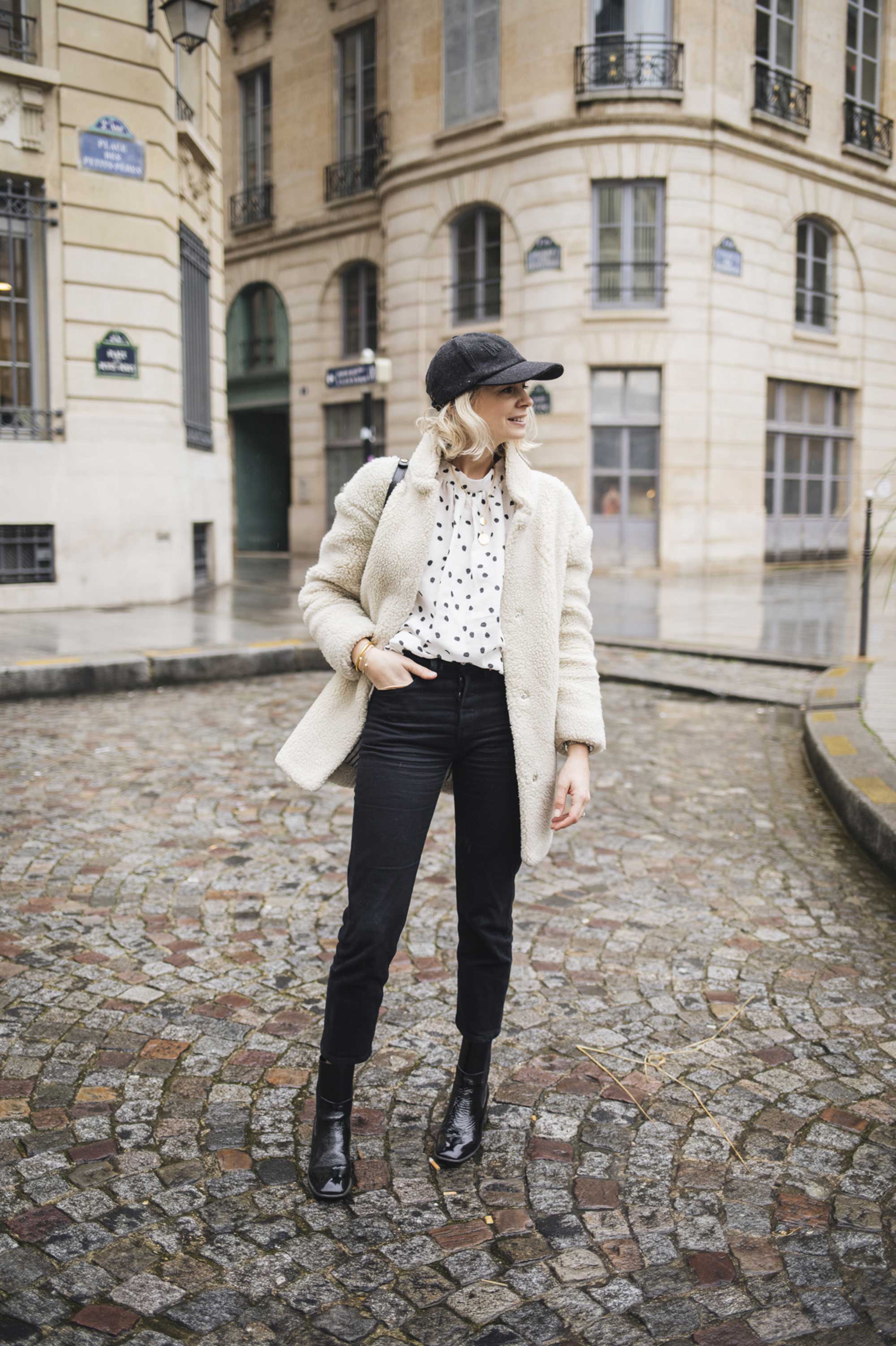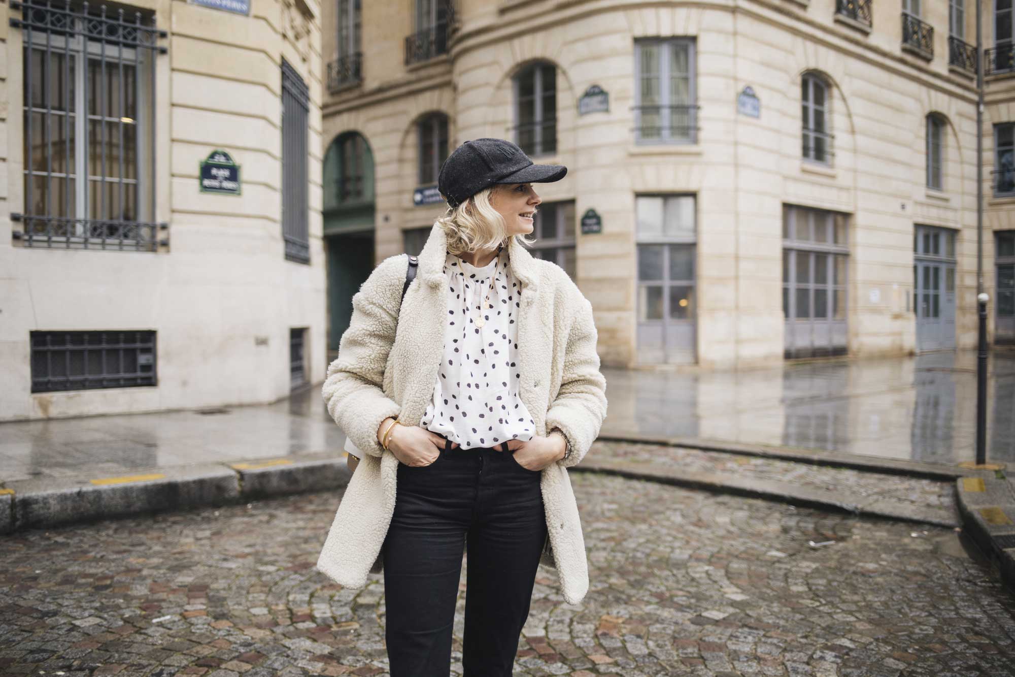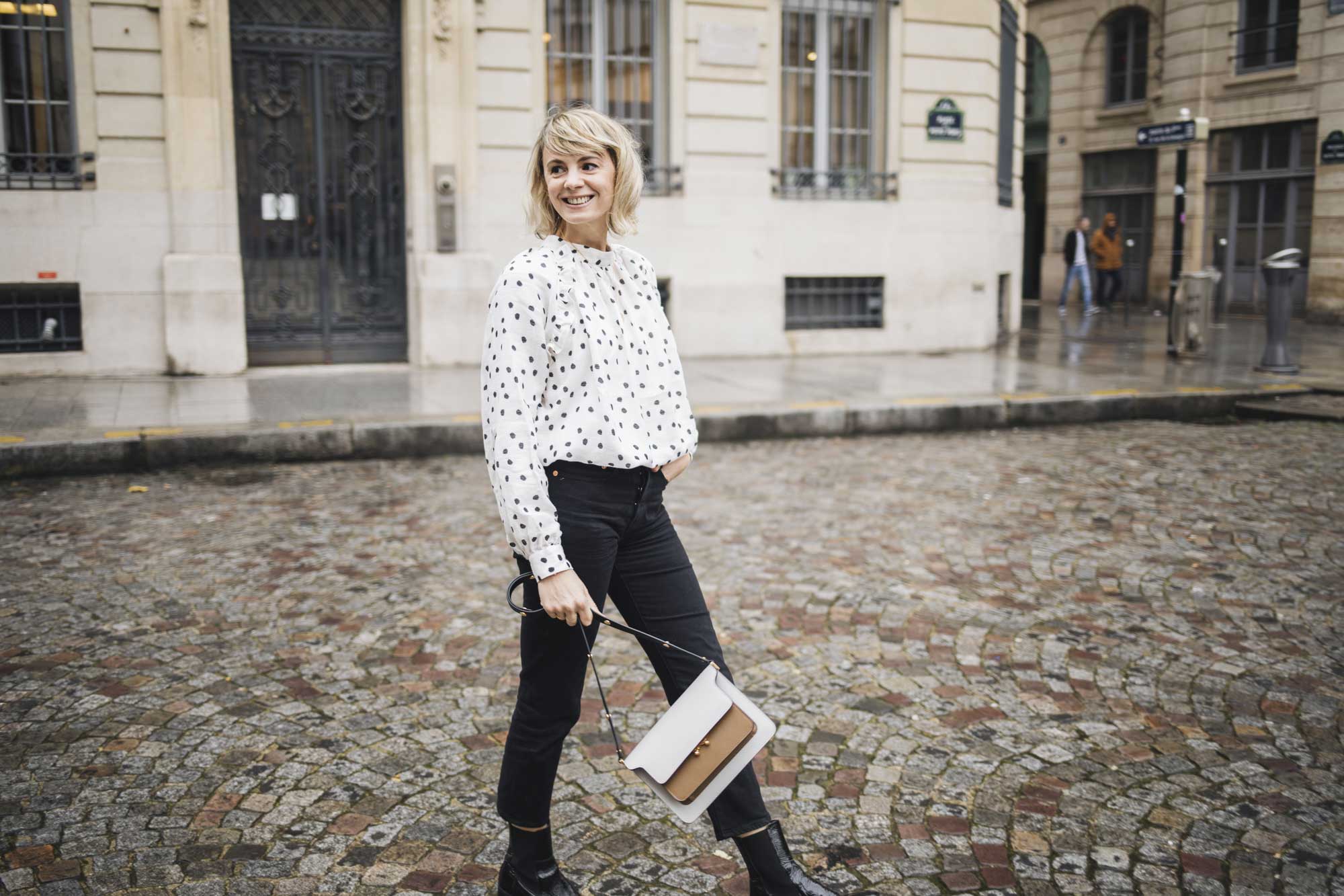 En matière de basiques j’aime à penser que s’il existe une sorte de « tronc commun » de basiques (la petite robe noire, la chemise blanche, le jean brut coupé droit, etc…) et des basiques plus, disons, personnels. La blouse / chemise à pois, par exemple, est l’un de mes basiques à moi. Sur une tenue archi simple comme celle-ci, elle permet d’apporter une petite touche de fantaisie en deux temps trois mouvements. Eh hop, le tour est joué !