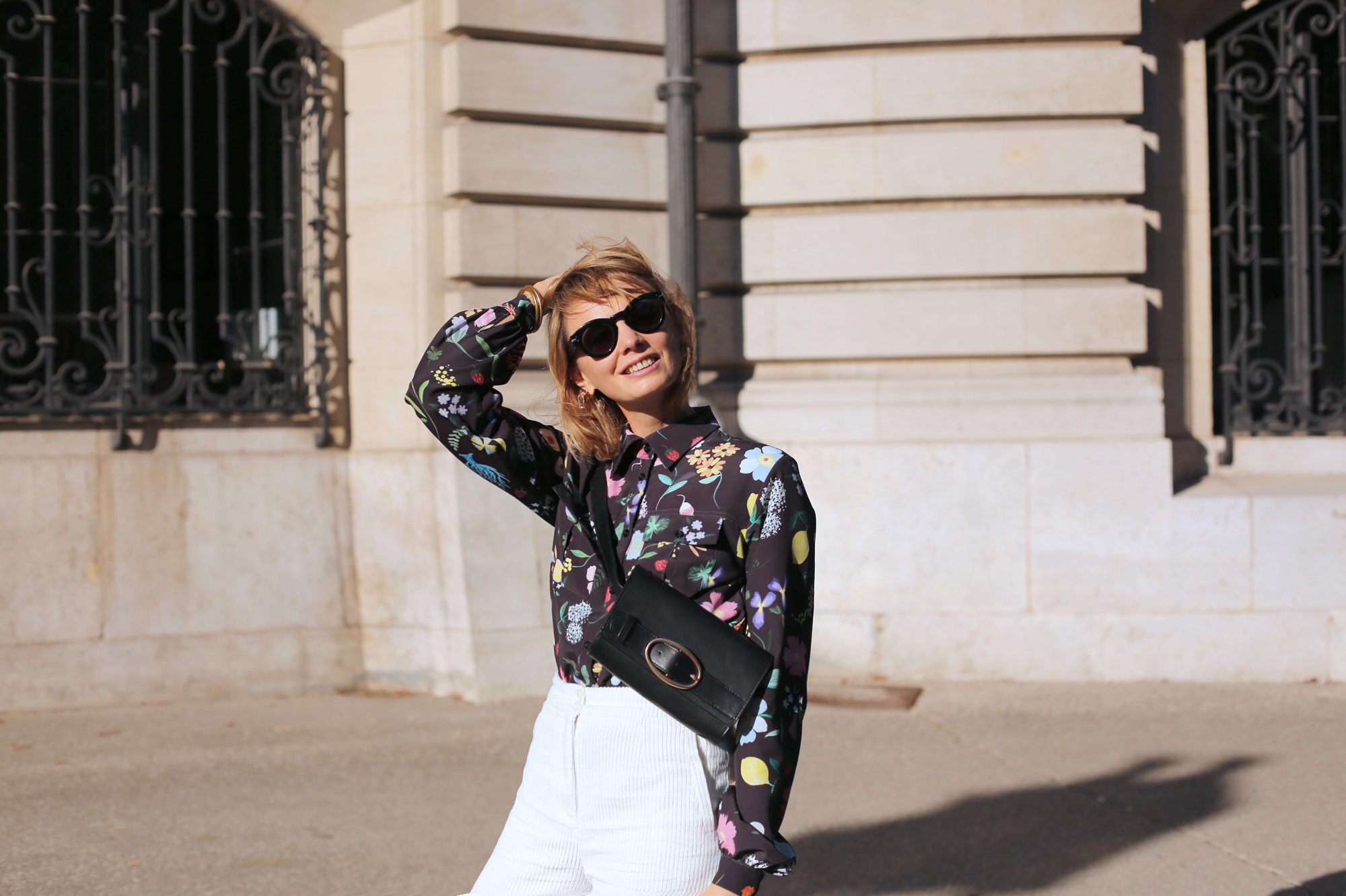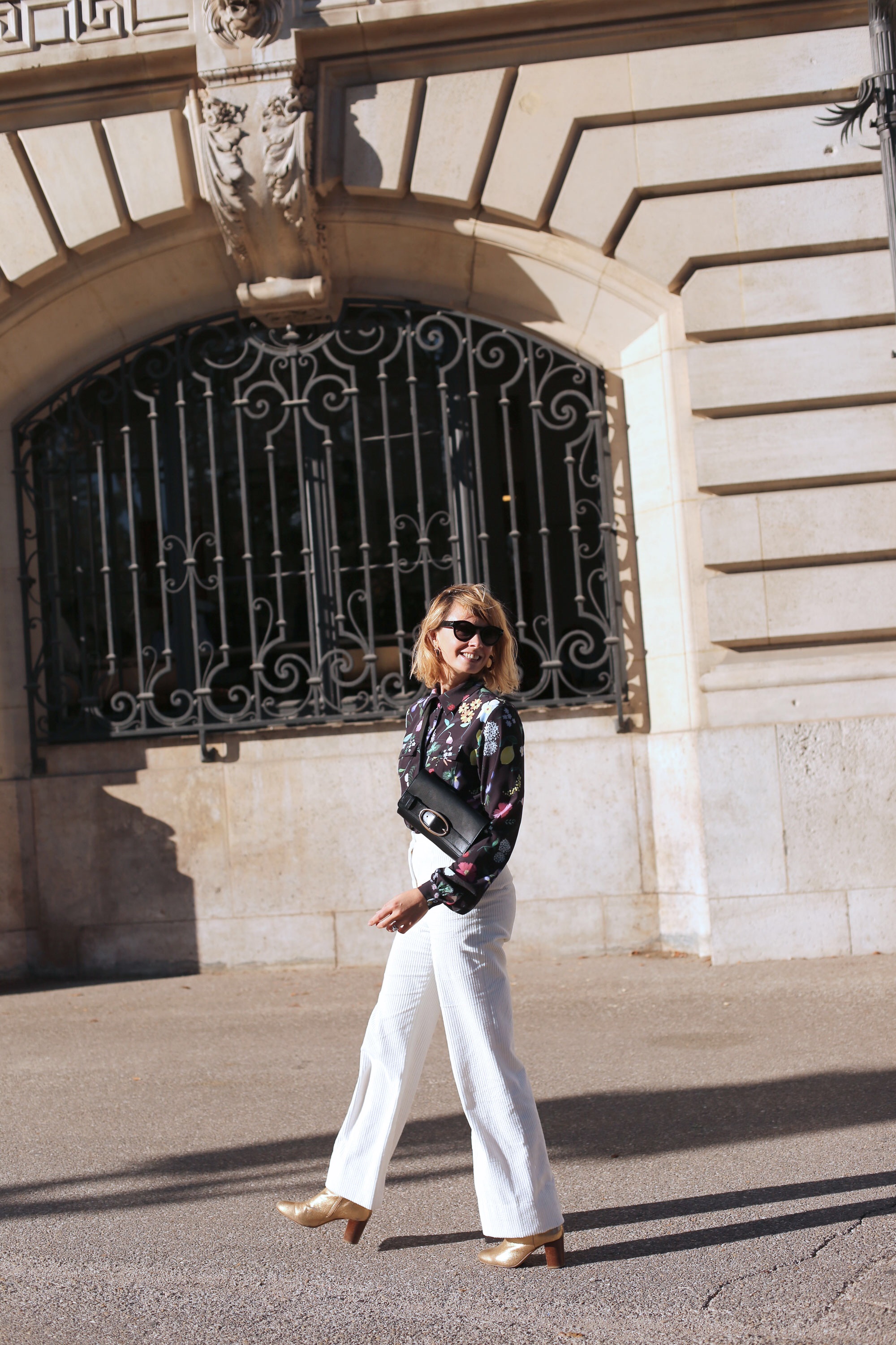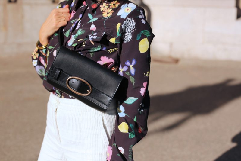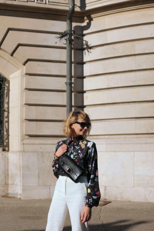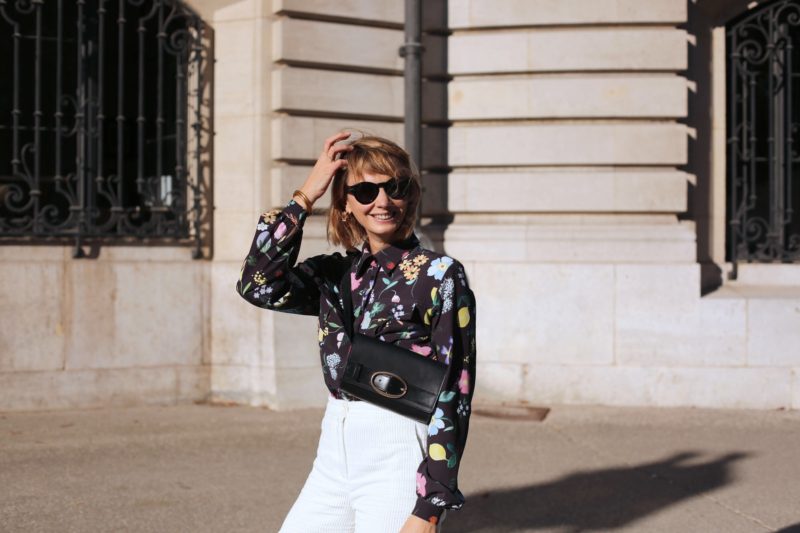 Le temps est schizo ? Pas grave… moi aussi ! Un pantalon blanc… en velours, une chemise noire à fleurs (et quelle chemise… bravo Lisa !) eh hop, la tenue parfaite pour affronter les frimas du matin et les chaleurs dont nous avons été gratifiés cette semaine. Profitons-en, visiblement, on renoue bientôt avec une météo plus automnale… Yummy !