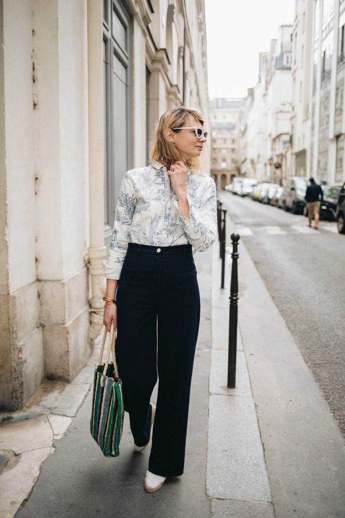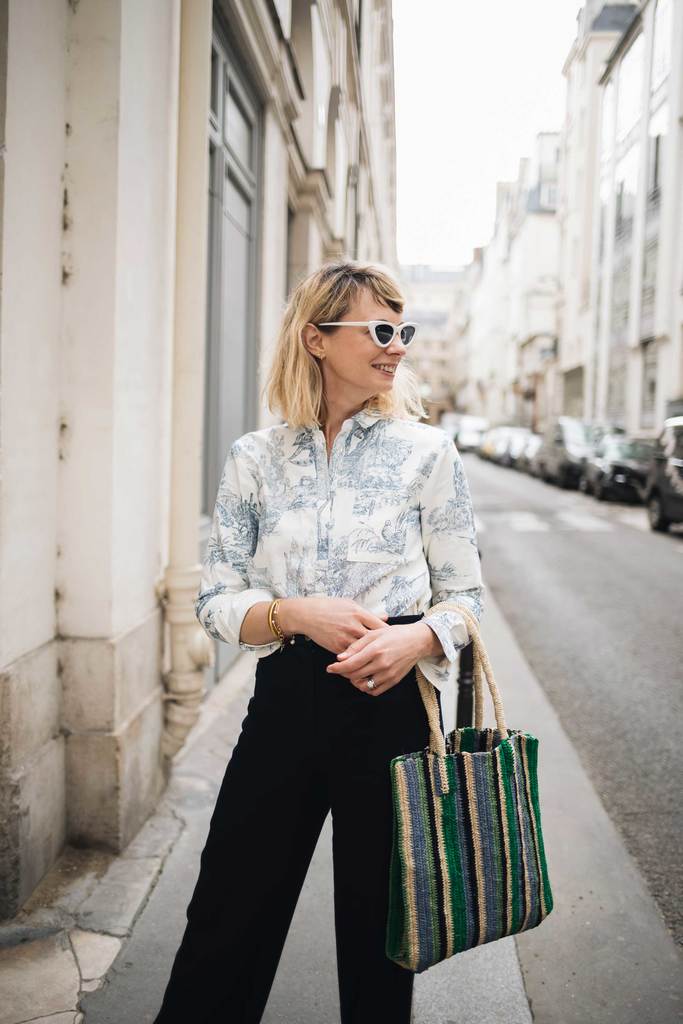 Le parfait combo un peu schizo d’une météo qui peut s’avérer légèrement en dents de scie…! Un pantalon facile à vivre (je me le suis offert il y a un peu plus d’un an, il bouloche à peine au bout de tout ce temps et j’aime énormément sa coupe), une chemise à la personnalité bien trempée et responsable, des espadrilles et un panier. Complètement schizo, je vous dis !