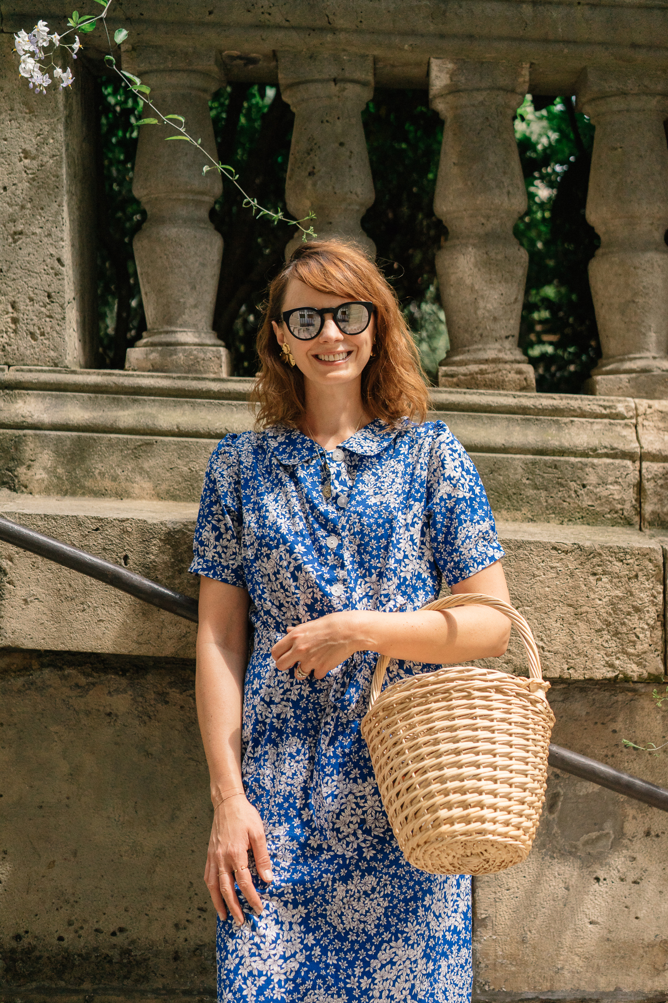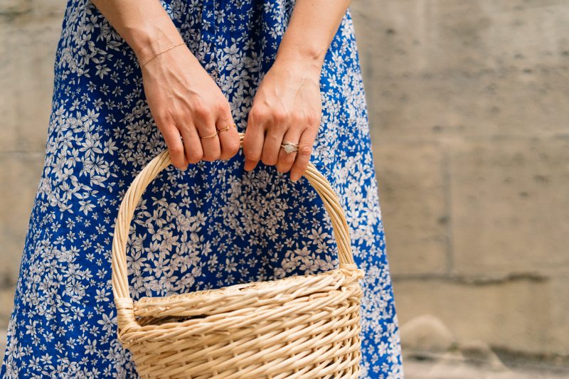 Ajoutez à cela un (énième…) panier (je louchais sur le fameux panier birkin depuis un bail, j’ai fini par dégoter celui-ci en ligne sur Etsy à un prix décent), une paire de lunettes « miroir » et des grosses BO pour donner un peu de pep’s à l’ensemble eh hop !