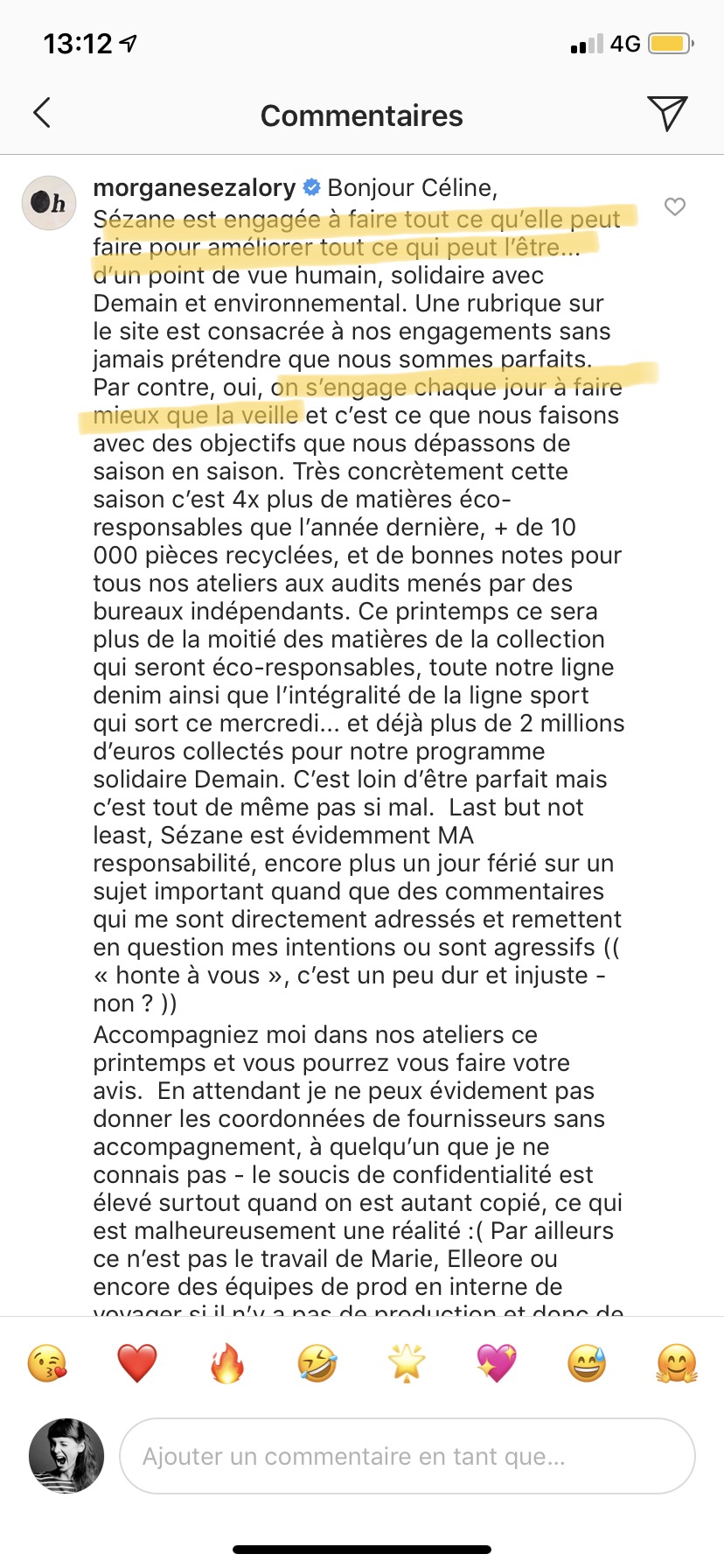 Quant à la transparence, Morgane, la fondatrice de Sézane, est la première à dire qu’ils peuvent mieux faire, je n’ai pas le sentiment que la marque manque de transparence ou essaye de nous bullshiter. Les objectifs sont clairement énoncés, les progrès également, que ce soit sur le site ou en commentaires, comme ici :