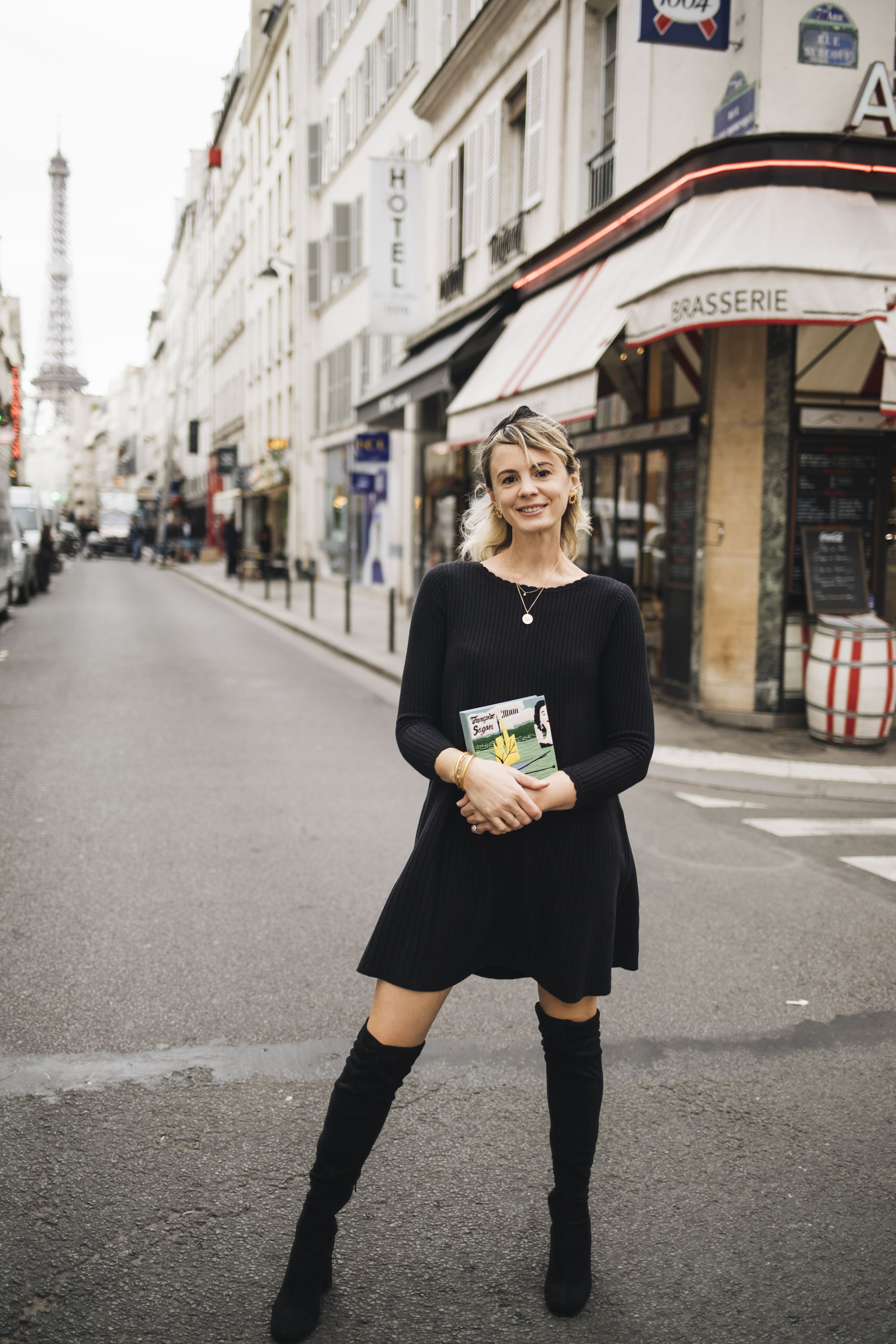 Mais il ne faut jamais dire jamais. La preuve avec cette robe là, que j’aime pour tout un tas de raisons : sa coupe, que je trouve facile à vivre avec des cuissardes comme ici, ou une paire de baskets, par exemple. Sa matière : 50% laine mérinos, 50% coton, les deux sont naturels et certifiés OEKO-TEX. Elle a donc tout bon et rejoint de ce pas les basiques de ma penderie ! (Bon, sauf que je l’ai prise un peu juste et que la taille au dessus n’est plus dispo…).