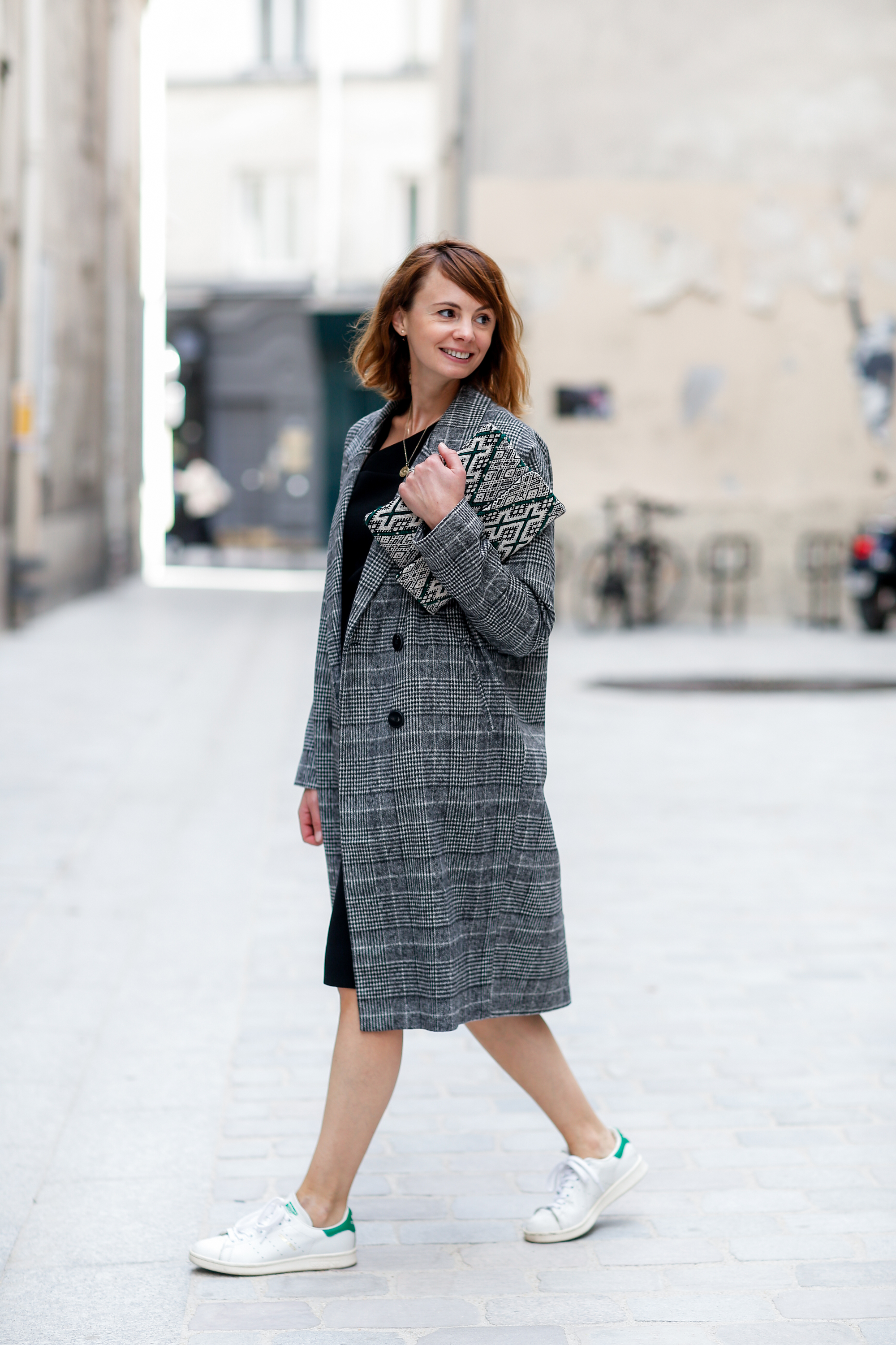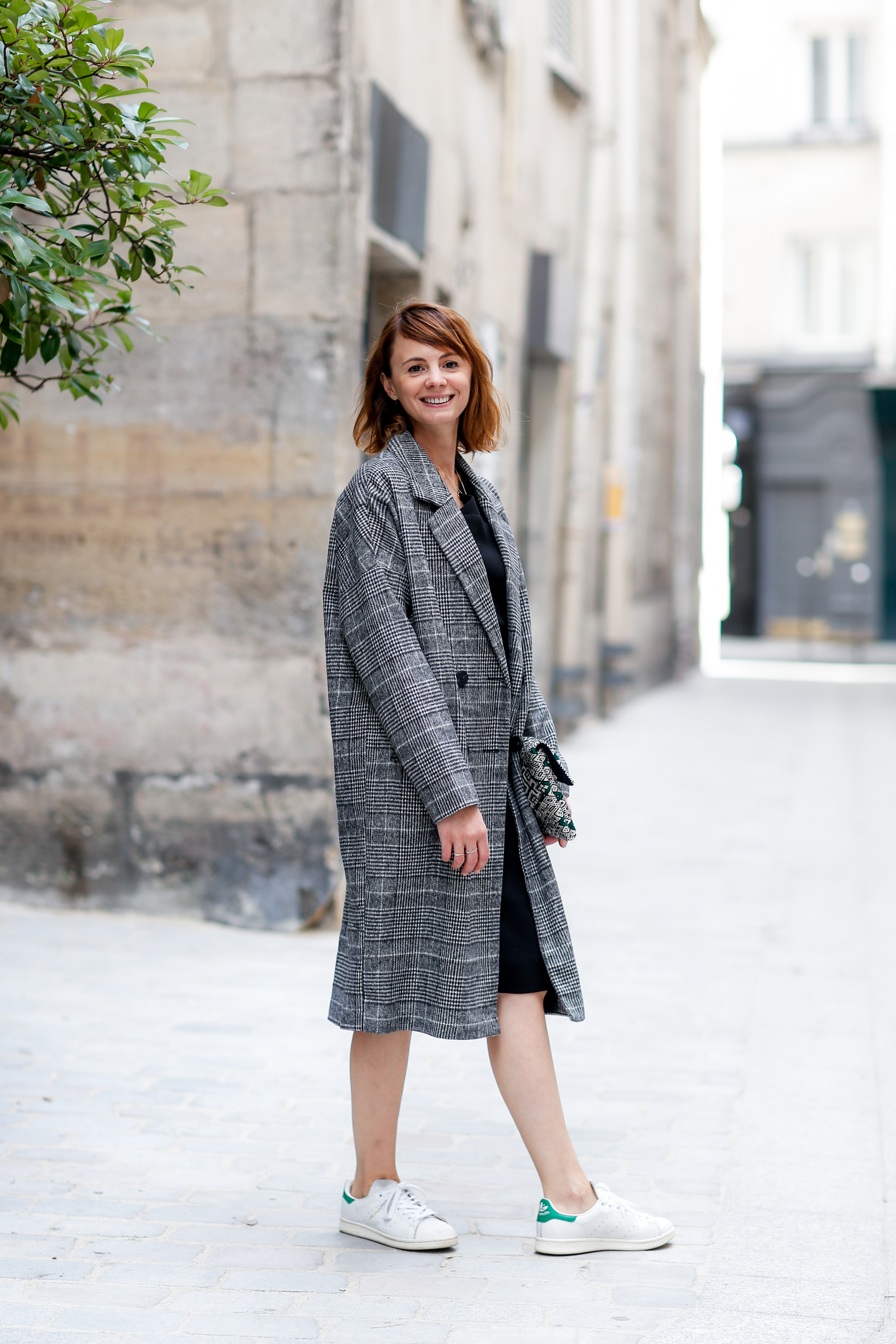 Superbe tenue, j’adore le fait de mélanger une robe assez chic avec des baskets et un manteau u peu loose ! Toujours le style Deedee 😉