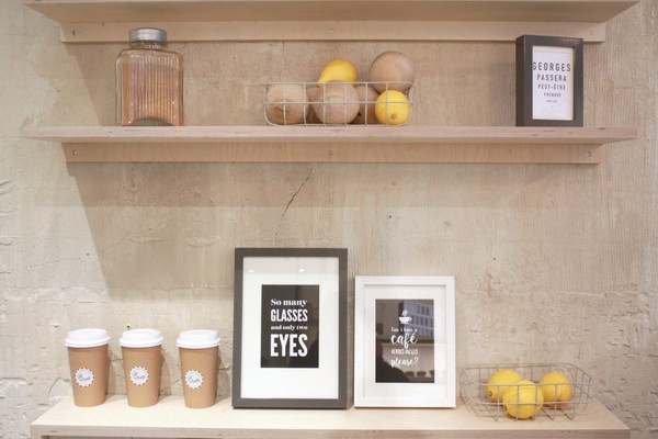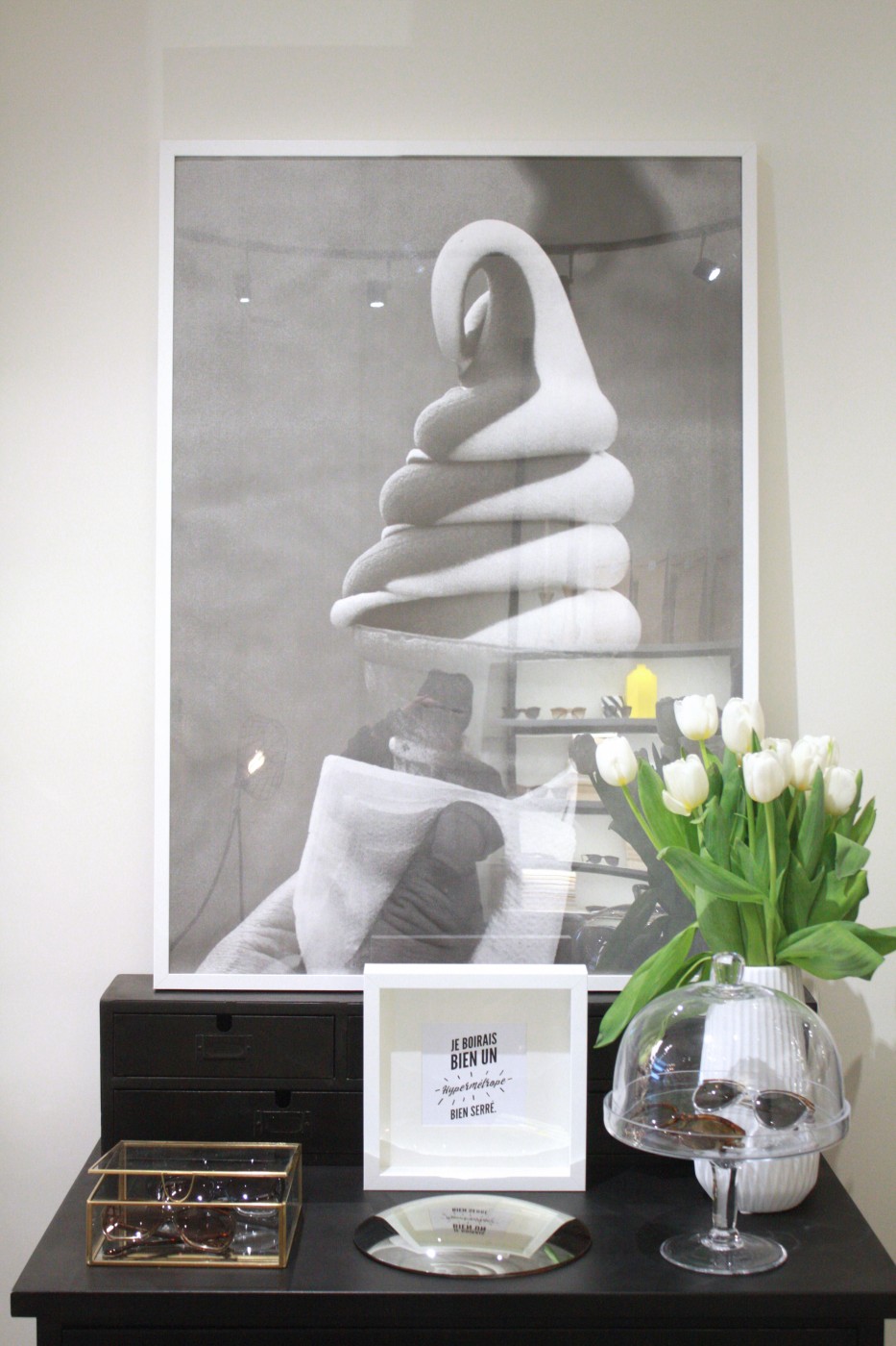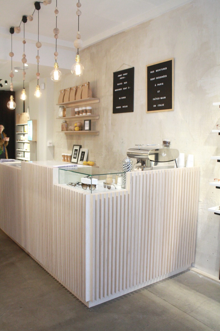Mais au Café Lunettes, on vient aussi pour déguster un café dans un espace chaleureux. Gratuitement (si !). Marbre, bois blond, métal… Les matériaux sont nobles et apportent au lieu cet esprit délicieusement rétro que l’on retrouve dans ces coffee shops vintages new-yorkais. L’accueil est à l’image de ces lieux : convivial. Sur place, on trouve aussi un petit guide du quartier pour se « montorgueilliser ». Je ne veux pas tout dévoiler, mais on y trouve notamment l’adresse d’Ismérie, élue meilleure coiffeuse de l’univers (ça n’est pas moi qui dirais le contraire !), celle de la fleuriste qui fait les plus beaux bouquets de Paris, ou bien encore celle du bar où vous pourrez déguster un Maggie Cassidy d’anthologie.
