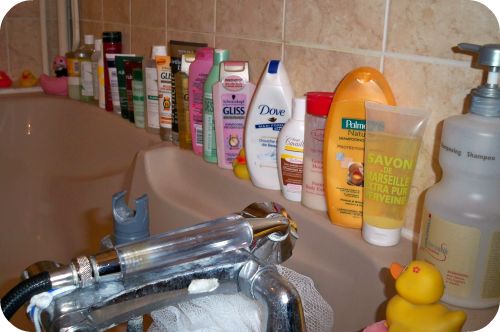 On se partage un placard, j’en prends les 2/3 et lui le reste mais en ce qui concerne la baignoire c’est le strict minimum : mon shampoing, mon après-shampoing, un gel douche pour deux (quand on s’est mis ensemble on s’est rendus compte qu’on utilisait le même), et le produit corps et cheveux du bébé avec lequel chéri se lave aussi les cheveux. Le tout sans paraben…