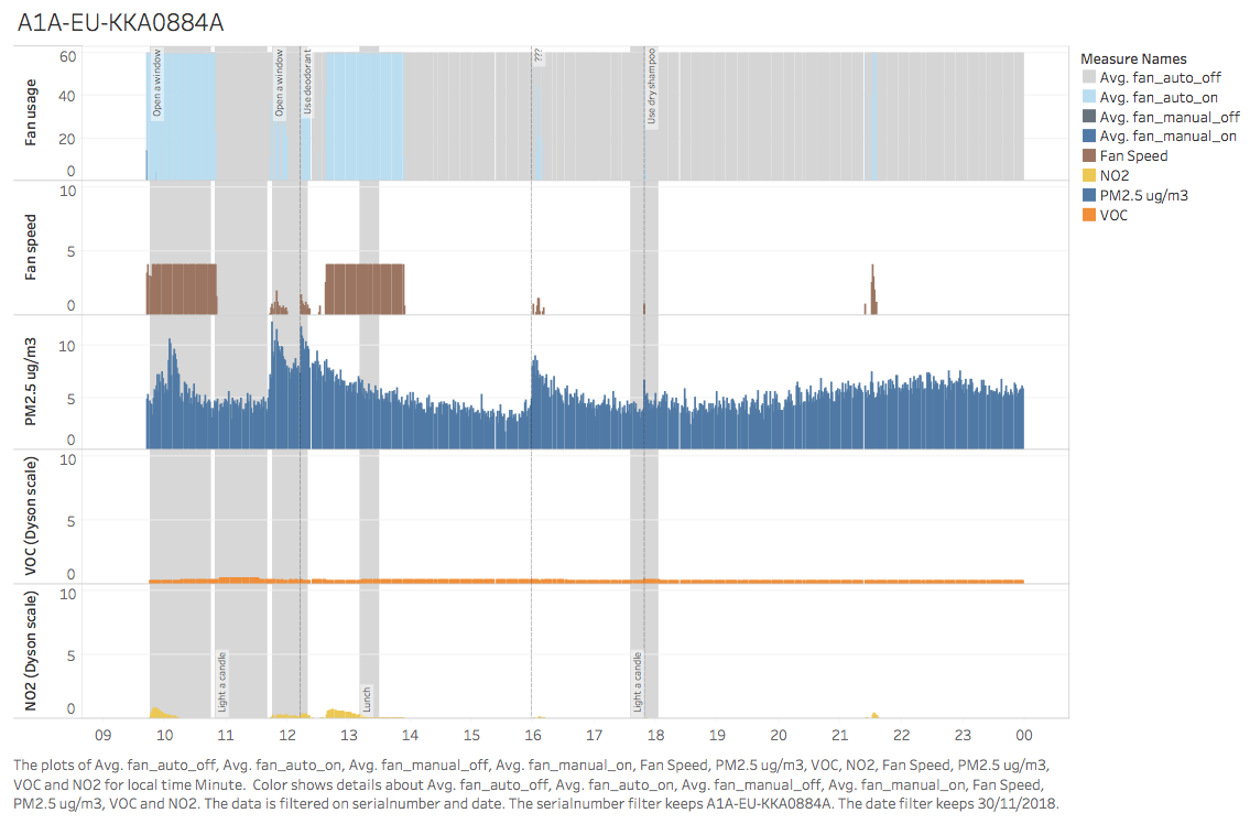 Vendredi dernier, j’ai donc passé la journée vissée derrière mon ordi pour voir ce que la bête avait dans le bide : la théorie, c’est bien. La pratique, c’est encore mieux ! Pendant une petite dizaine d’heures, j’ai consigné dans un tableau ce qui se passait au bureau et qui pouvait avoir une incidence concrète sur la pollution : j’ai par exemple ouvert la fenêtre qui donne sur une rue du genre passante, j’ai allumé une bougie, préparé un dej sommaire, mis du shampoing sec en fin de journée avant de sortir et autres actions de ce type. A la fin de la journée, j’ai envoyé toutes ces datas à Robin L’évêque, ingénieur chez Dyson à Malmesbury au UK pour qu’il les analyse.