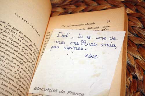 Un peu plus loin dans le livre, un bout de feuille me tombe littéralement entre les mains : il s’agit d’un mot doux rédigé par une amie d’enfance… Je revois instantanément le moment où elle l’a rédigé, perchée sur son lit de princesse dans sa chambre que je jalousais secrètement, et mille autres souvenirs se rappellent à moi comme par enchantement.