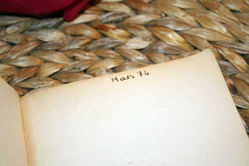 Sur la première page, une date… 1974… Mes parents viennent à peine de se rencontrer. Ce livre appartient à ma mère. Je me surprends à l’imaginer à ce moment là, sa vie, ses amis, son idylle naissante avec mon père.