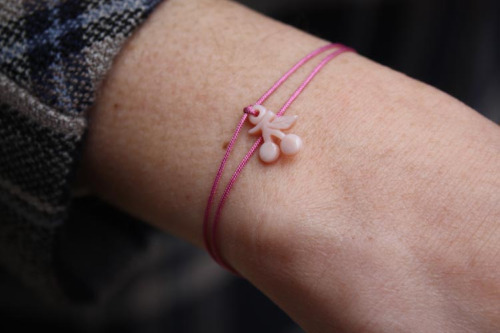 Bracelet avec gri gri en nacre (libellule ou cerise), sur cordon à enrouler en double sur le poignet, sans oublier de faire son vœu !