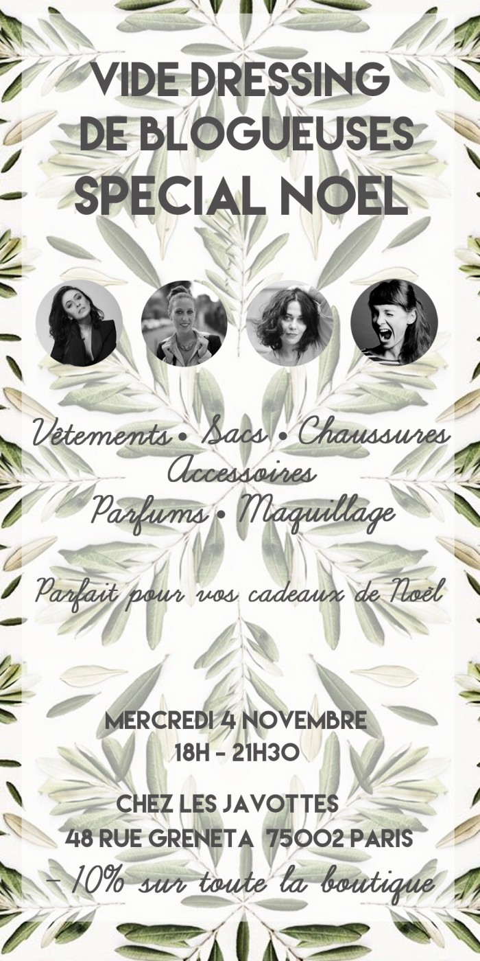 Ah oui, un peu plus encore et j’oubliais de vous dire ici aussi qu’on organise avec les copines un gros vide dressing d’anthologie ! Comme d’habitude, il y aura des vêtements à prix bradés (je vends pas mal de pièces Roseanna, Sézane, Claudie Pierlot, etc.), des accessoires (chaussures / sacs / bijoux…). Mais aussi plein de cosmétiques et parfums à prix mini. Et une réduc rien que pour vous sur toute la boutique des Javottes qui nous accueille. Pointures 38 à 40, tailles 34 à 40. On se voit mercredi ?