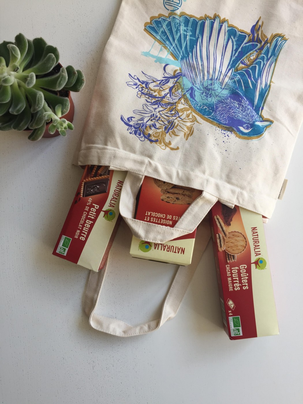 Si vous n’avez pas vu passer l’info sur Instagram (virés !), sachez qu’en ce moment, Naturalia vend deux tote bags signés par deux street artists. L’intégralité des bénéfices sont reversés à l’association Réseau Cocagne.