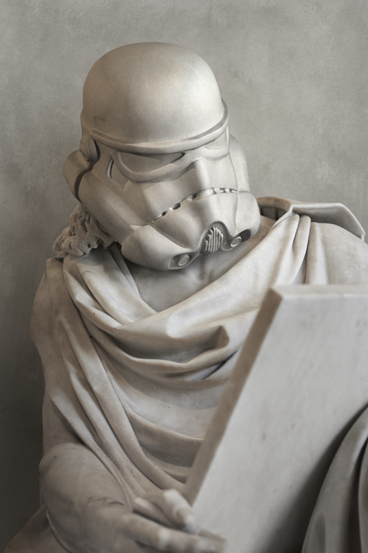 « Je suis allé au Louvre il y a 6 mois et j’ai imaginé quelles sculptures pouvaient se marier avec Darth Vader, Boba Fett, Yoda… J’ai ensuite travaillé avec un modeleur 3D (pour la conception des casques) et un retoucheur pour la texture et l’intégration sur les sculptures. L’idée finale est que le spectateur pense qu’il s’agit de vraies sculptures taillées dans un même bloc de marbre ».