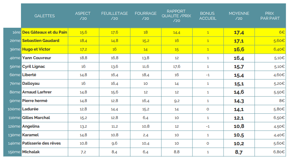 Sur une courte tête et une excellente moyenne, c’est la galette des rois de Des Gâteaux et du Pain qui décroche la timbale ! Son prix est dans la moyenne, la saveur de son fourrage quasi inégalable.