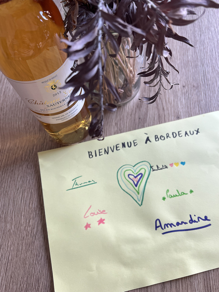 Les petites surprises : à Bordeaux, nos hôtes nous ont gratifiés de petits chocolats pour les enfants, de deux bouteilles de vin et d’un petit mot rédigé par leurs enfants. Adorable ! De notre côté, nous avions également laissé du vin et des olives achetées sur le marché qu’on adore, et j’ai regretté la petite attention à laquelle je n’ai pas pensé pour leurs trois filles… En repartant, on leur a laissé à notre tour des petits chocolats et un petit mot de remerciements. Mot qu’on a également trouvé chez nous en rentrant… Vraiment chouette !